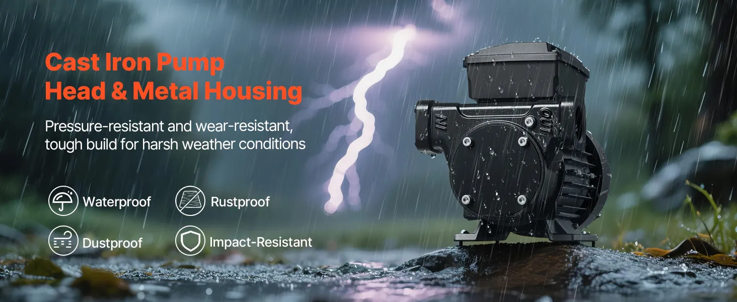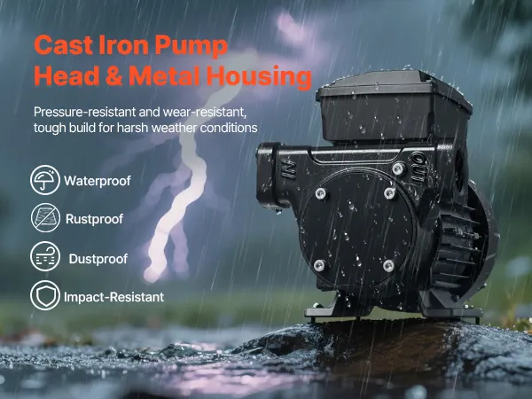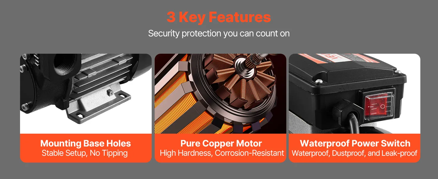 Robuste Gusseisenkonstruktion: Gusseisen für hohe Druck-, Verschleiß- und Korrosionsbeständigkeit. Diese 230-V-Diesel-Transferpumpe mit wasserdichtem Schalter verhindert das Eindringen von Wasser in Außenbereiche und feuchte Umgebungen.