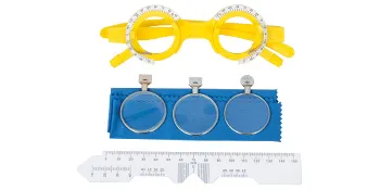 Das 68-teilige Versuchslinsenset enthält 56 Sphärische Linsen, 12 Zylinderlinsen und einen Versuchsrahmen.