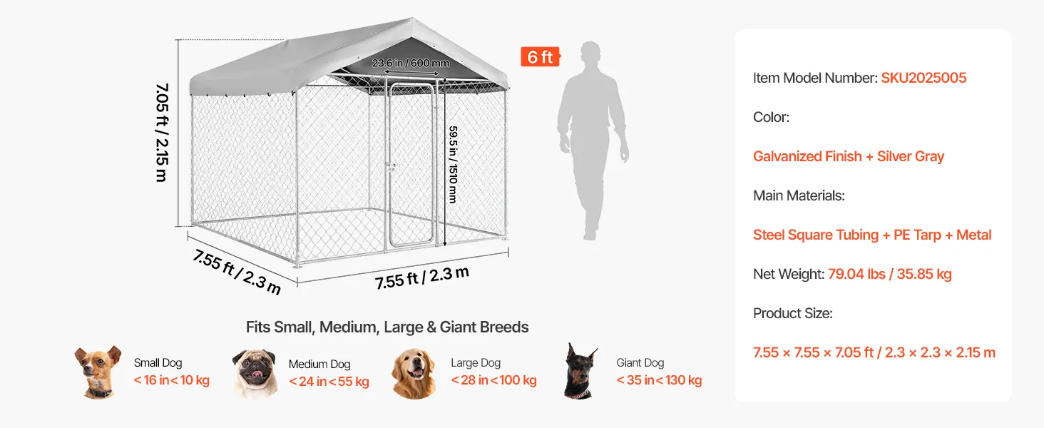 Besonders viel Platz: Das 2,3 x 2,3 x 2,15 m (7,55 x 7,55 x 7,05 Fuß) große Hundehaus bietet Ihrem Hund viel Raum zum Toben, Herumstreifen und Entspannen – wie eine geräumige Außenwohnung. Hinweis: Für zusätzlichen Schutz können Sie ein Netz über dem offenen Dach anbringen, damit Ihr Hund nicht herausspringt