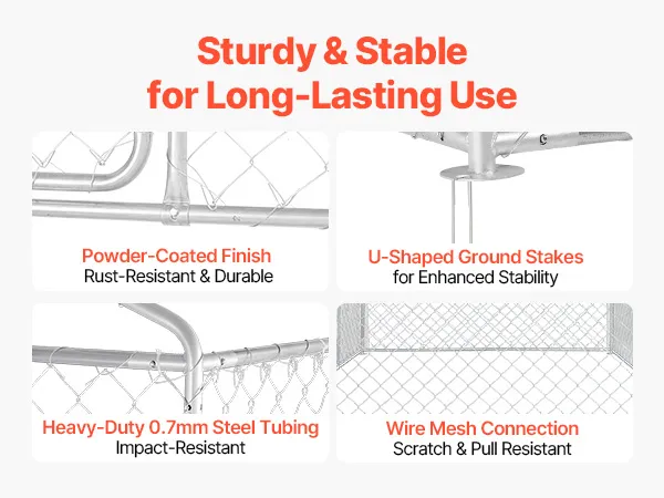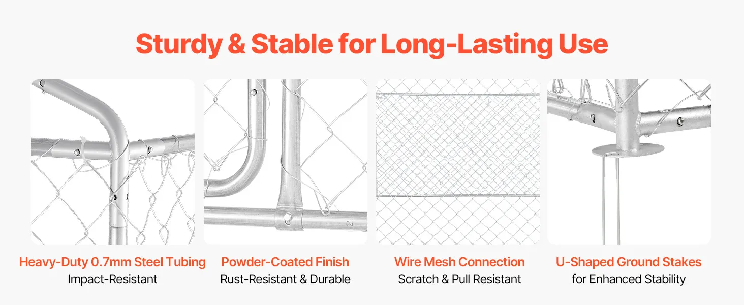 Das große Hundegehege besteht aus robusten Stahlrohren und verschweißten Drahtgitterplatten mit rostbeständiger Beschichtung und ist daher biege-, verschleiß- und korrosionsbeständig. Sie ist für den langfristigen Einsatz im Freien konzipiert.
