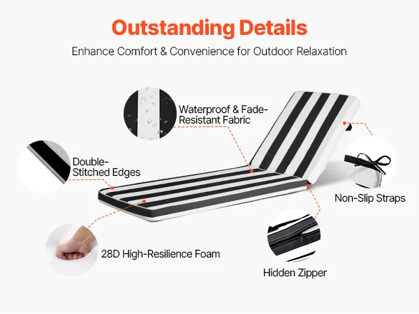 Dicker, hochdichter Schaumstoff: Gefüllt mit bis zu 7,5 cm dickem 28D-Hochleistungsschaumstoff ist unsere Deckchair-Auflage weich, stützend und erholt sich nach Gebrauch schnell wieder. Egal, ob Sie stundenlang entspannen oder es häufig bewegen, dieses Gartenmöbelkissen bleibt weich und stützend. Tipp: Warten Sie nach dem Auspacken 24 Stunden, bis es sich vollständig entfaltet hat.