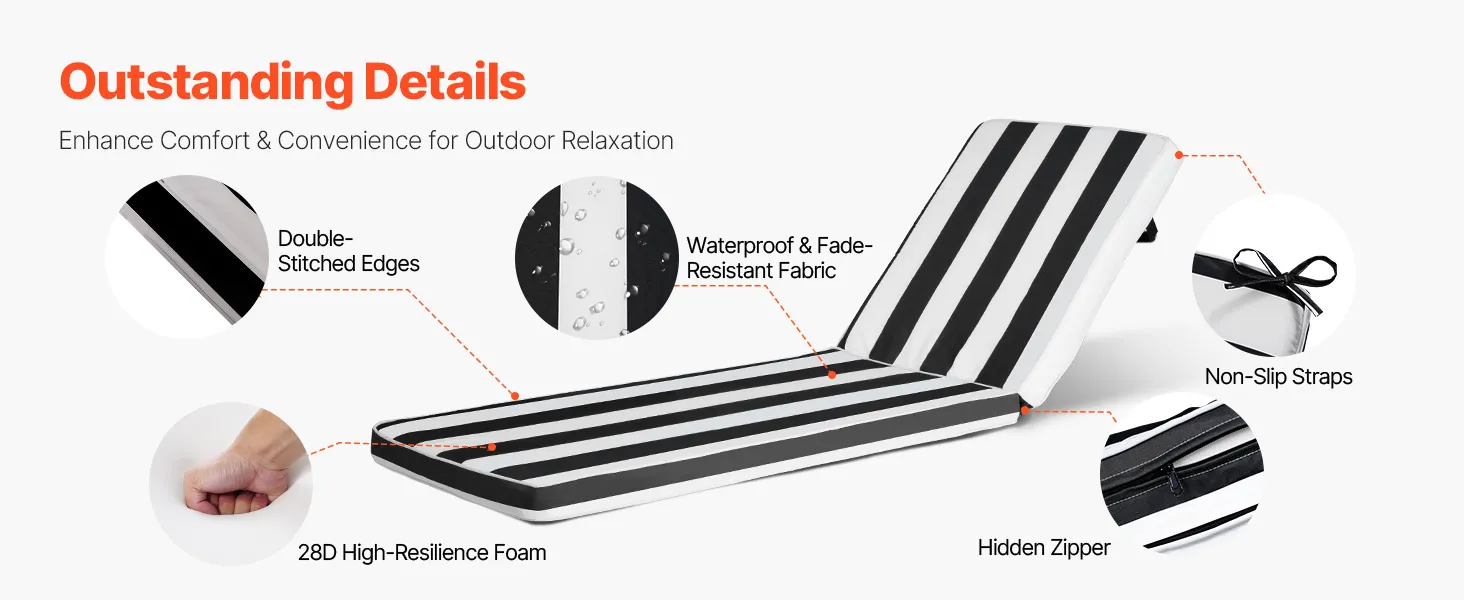 Gefüllt mit 28D-Schaumstoff mit hoher Dichte und umhüllt mit wasser- und farbechtem Stoff, bleibt dieses Gartenmöbelkissen bei jedem Wetter bequem und langlebig. Anti-Rutsch-Gurte halten es sicher an Ort und Stelle, während doppelt genähte Kanten und ein versteckter Reißverschluss sowohl Haltbarkeit als auch Stil verbessern.