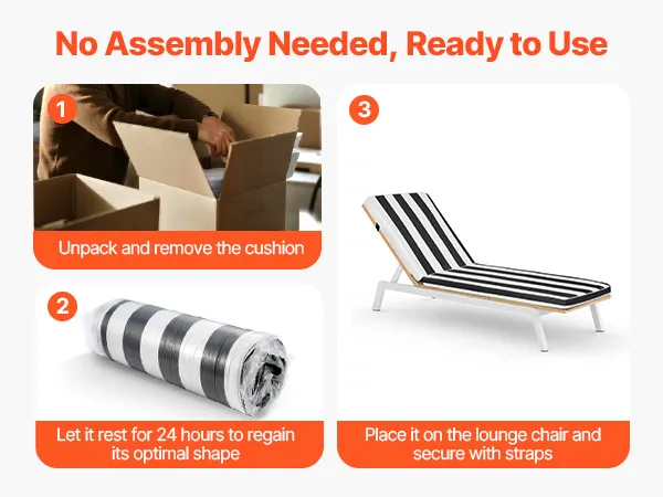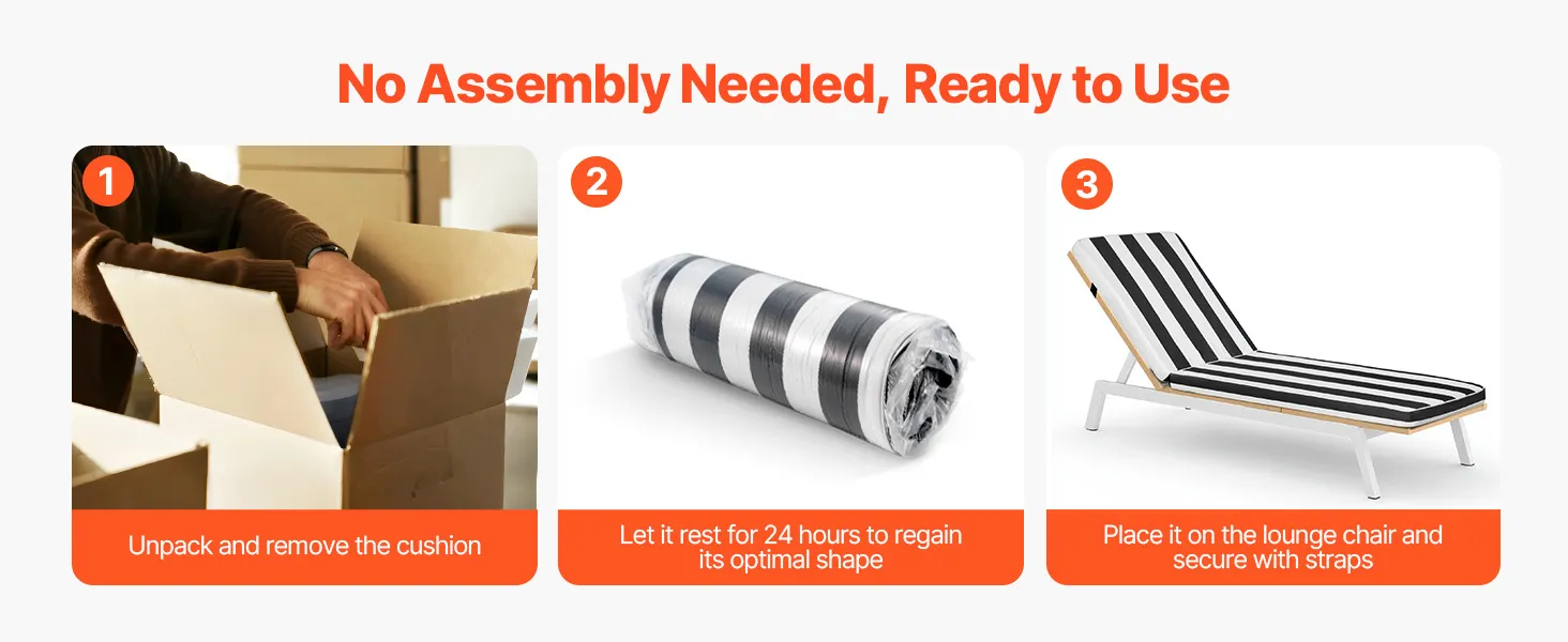 Einfach auspacken und 24 Stunden ruhen lassen, bis es sich vollständig ausdehnt. Anschließend auf Ihrem Liegestuhl platzieren und mit den Gurten befestigen – fertig für sofortigen Komfort.
