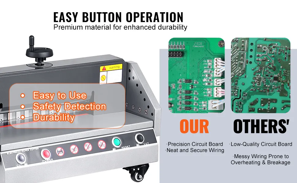 Komfortabel & langlebig: Das Bedienfeld erhöht den Benutzerkomfort. Der Papierschneidevorgang mit zwei Tasten und hochwertigen Chips sorgt für Langlebigkeit. Die Klinge aus Schnellarbeitsstahl sorgt für Robustheit und Langlebigkeit und bietet so ein komfortables und zuverlässiges Arbeiten
