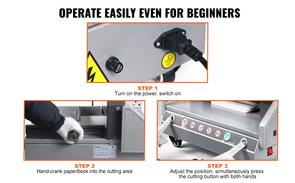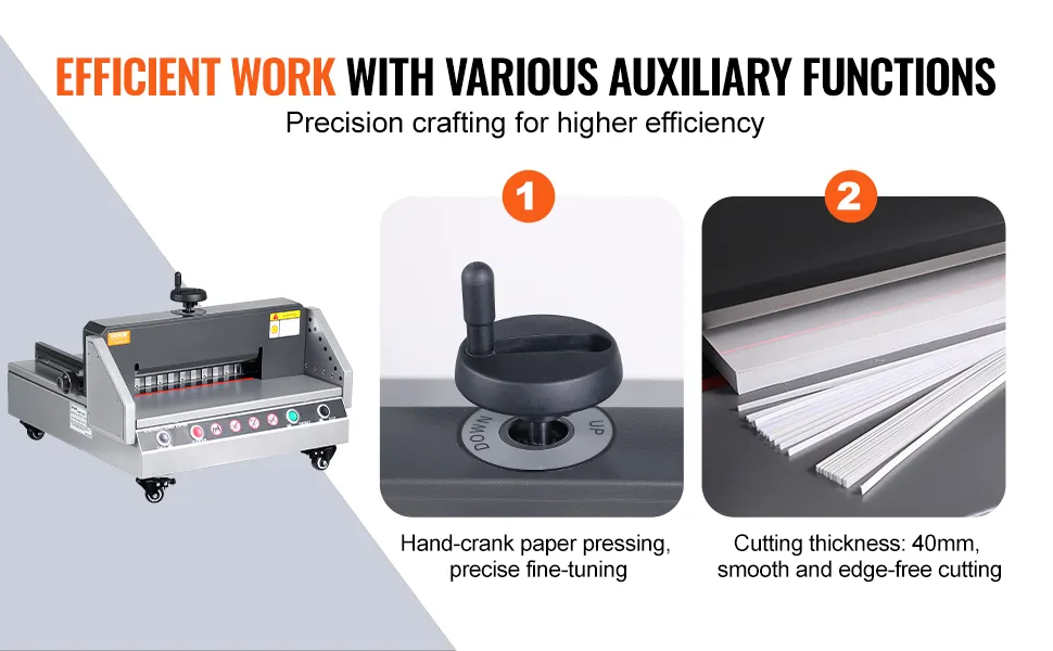 Präzises Papierschneiden: Wir haben eine Reihe von Zusatzfunktionen integriert, darunter einen handbetriebenen Papierschieber, der Zeit spart und die Geschwindigkeit erhöht. Er unterstützt präzise Feineinstellungen. Die hochwertigen, scharfen Klingen schneiden mühelos Papier bis zu einer Dicke von 1,57 Zoll (40 mm). Erleben Sie ein glattes, kantenfreies Schneiderlebnis