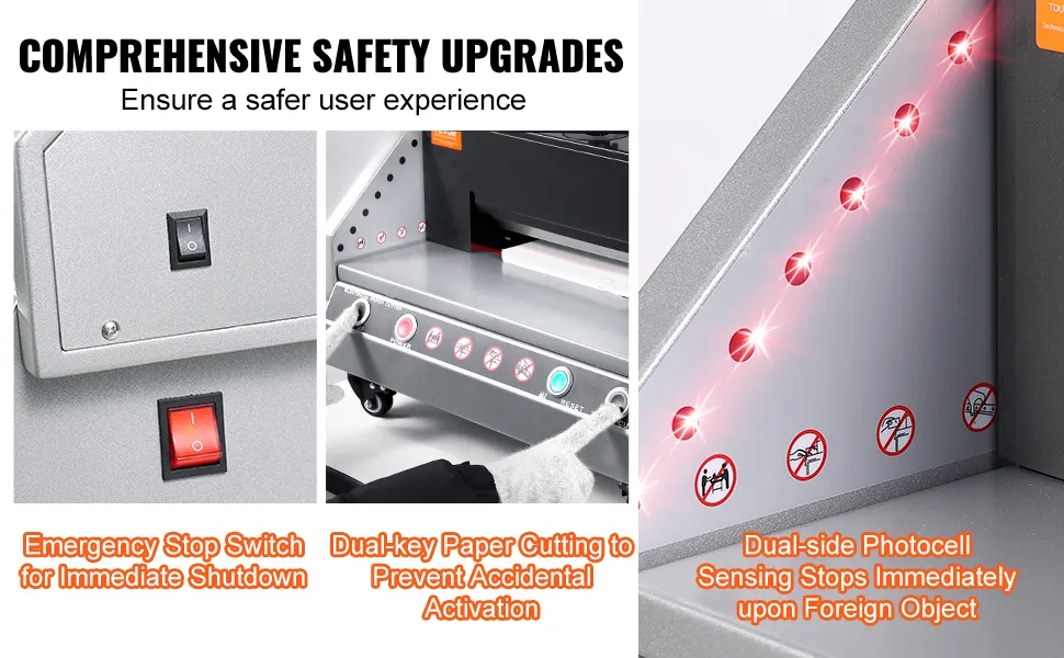 Verbesserte Sicherheitsmaßnahmen: Um die Sicherheit während des Betriebs zu gewährleisten, ist die Desktop-Papierschneidemaschine mit Infrarotsensoren ausgestattet, die den Betrieb sofort stoppen, wenn Fremdkörper erkannt werden. Zusätzlich erfordert ein Doppeltasten-Papierschneidesystem das gleichzeitige Drücken der Schneidetaste mit beiden Händen, um den Schnitt zu starten
