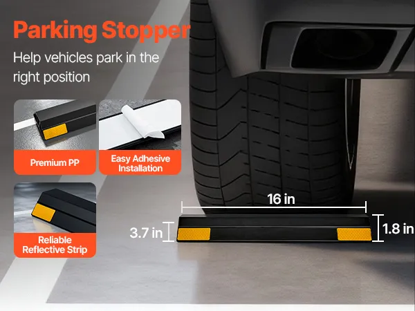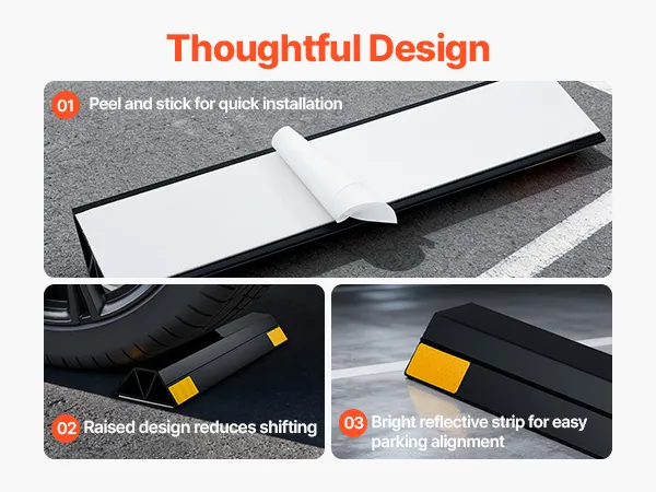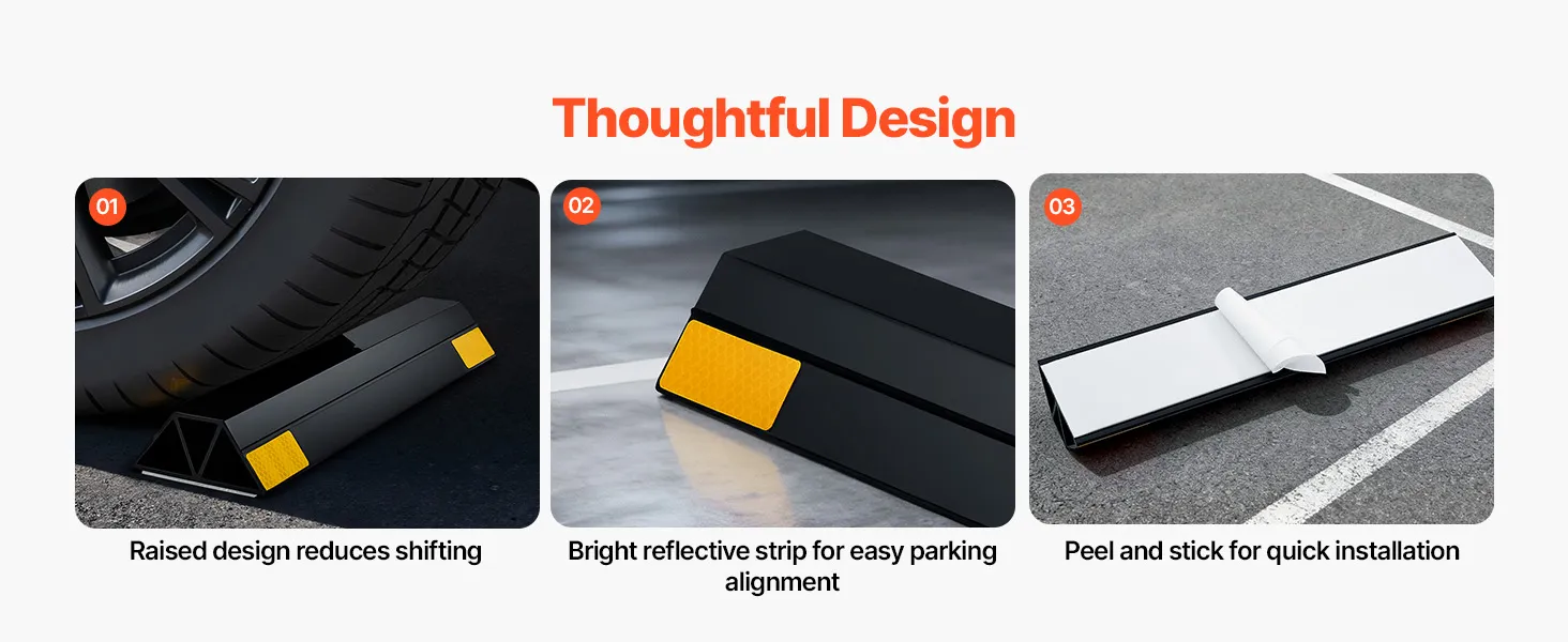 Unser Parkblock verfügt über ein erhabenes Design, um ein Verrutschen zu verhindern. Helle Reflektorstreifen erleichtern die Identifizierung des Parkplatzes. Einfach abziehen und aufkleben für eine schnelle Installation.