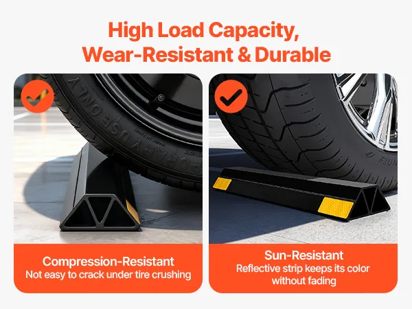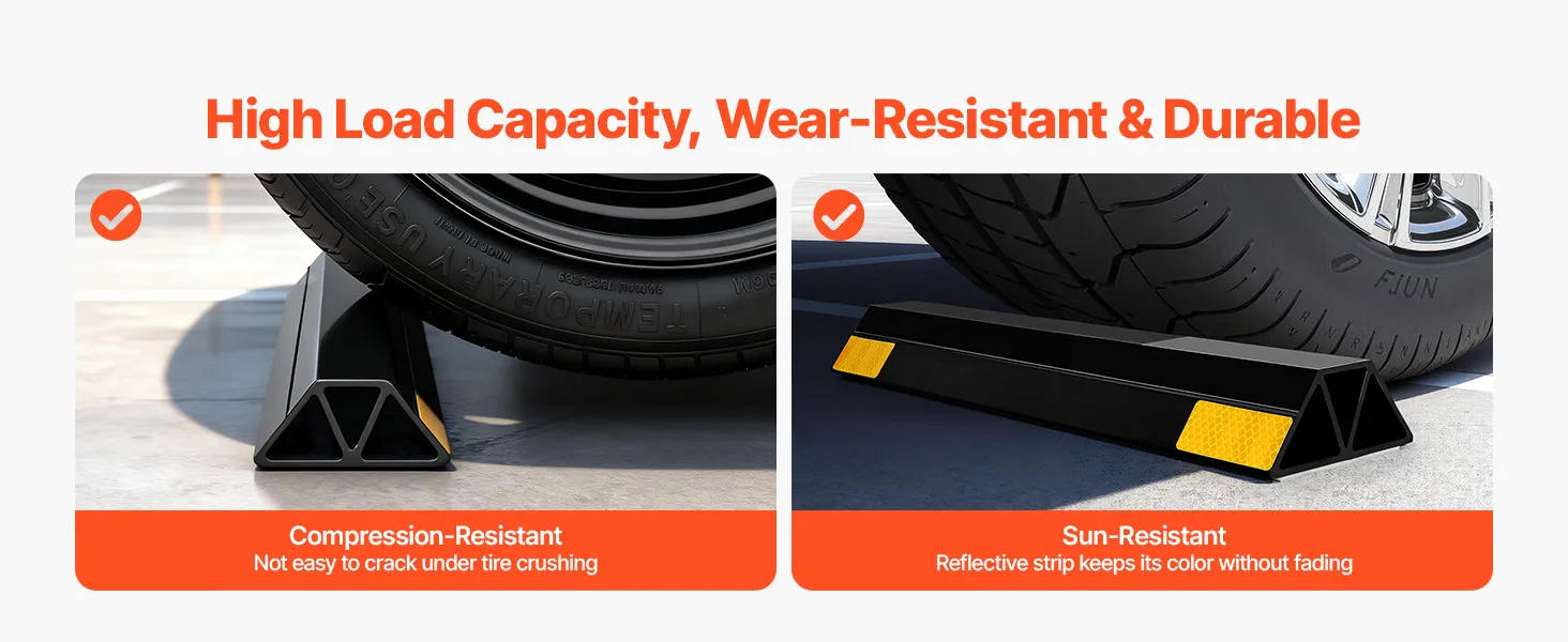 Der Radstopper ist mit einer hohen Tragfähigkeit ausgestattet und hält Reifenquetschungen stand, ohne zu reißen. Dank des sonnenbeständigen Designs bleibt die Farbe der Reflektorstreifen dauerhaft leuchtend.