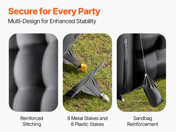 Ausgestattet mit verstärkten Nähten, 8 Eisen- und 8 Kunststoff-Bodenpfählen sowie Sandsäcken bleibt dieser aufblasbare Nachtclub auch im Freien stabil.
