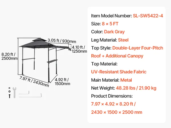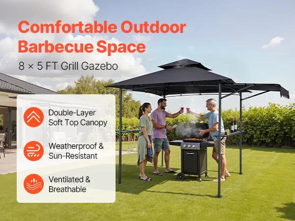 Dieser Grillpavillon wird mit Bodenverankerungen geliefert, die nach der Installation für hervorragende Stabilität sorgen – Sie müssen sich also keine Sorgen machen, dass er vom Wind weggeweht wird. Außerdem verfügt er über eine ausziehbare Markise, mit der Sie den Schattenbereich ganz einfach anpassen können, um Ihre Grillpartys noch komfortabler und entspannter zu gestalten.