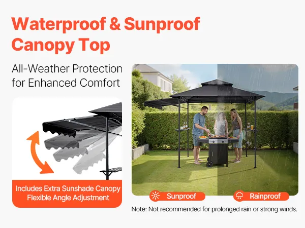 Doppelstöckiges Vordach: Der Grillpavillon verfügt über ein doppelstöckiges Dach, das die Luftzirkulation fördert und Rauch schnell ableitet, für frische Luft. Das aus UV-blockierendem Stoff gefertigte Vordach bietet zuverlässigen Sonnenschutz und leichten Regenschutz. Die verlängerten Seitenmarkisen erweitern Ihren Schattenbereich für entspannte Treffen im Freien.