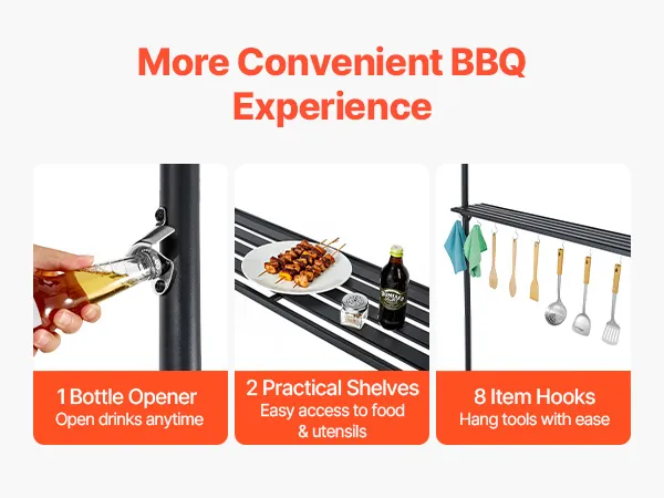 Funktionen unseres Grillpavillons wie ein eingebauter Flaschenöffner, praktische Seitenablagen für Lebensmittel und Utensilien sowie Haken zum Aufhängen von Werkzeugen machen das Grillen im Freien bequemer und übersichtlicher.