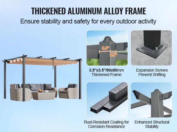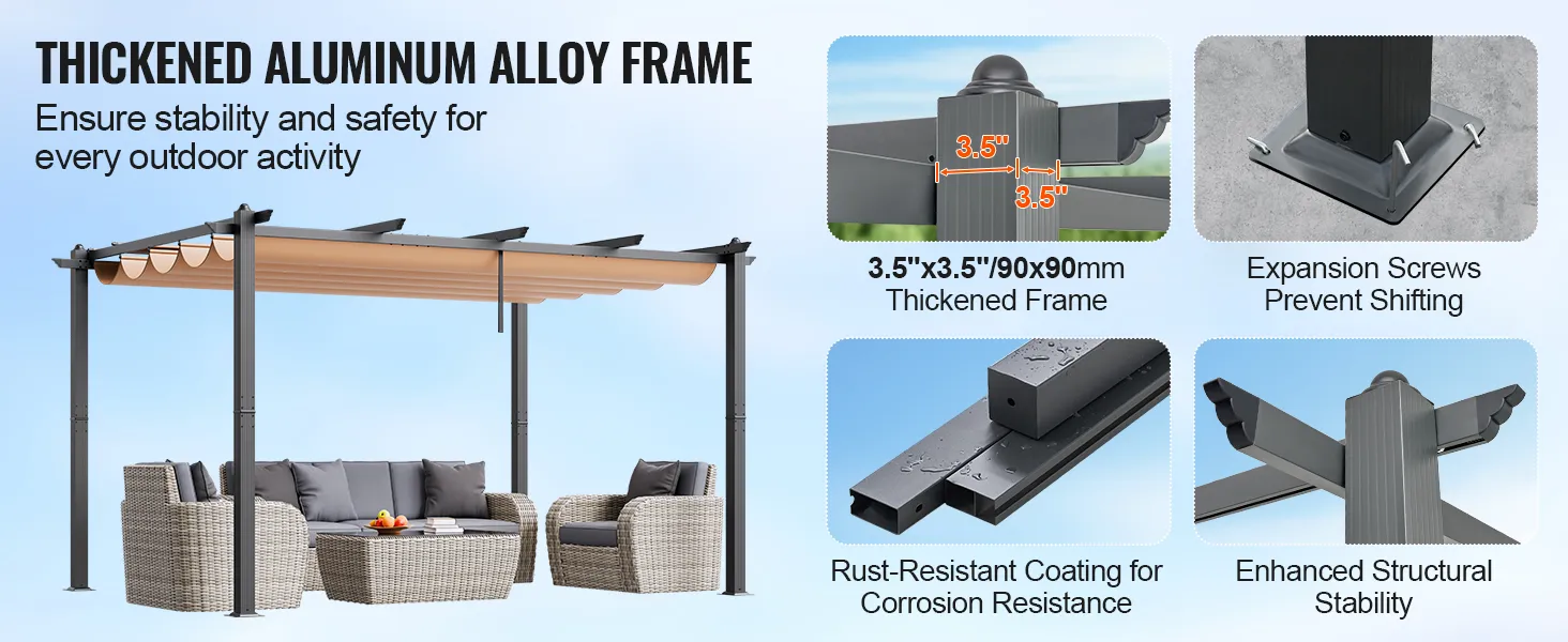 Robust & langlebig: Unsere einziehbare Pergola verfügt über einen robusten Rahmen aus Aluminiumlegierung, der Stabilität bei allen Wetterbedingungen gewährleistet. Die rostbeständige Beschichtung und die verdickten Pfosten (3,5 x 3,5 Zoll / 90 x 90 mm) bieten außergewöhnliche Korrosionsbeständigkeit und Festigkeit und sorgen auch bei starkem Wind für Stabilität. Die Bodennägel und die oberen Querbalken bieten zusätzliche Sicherheit