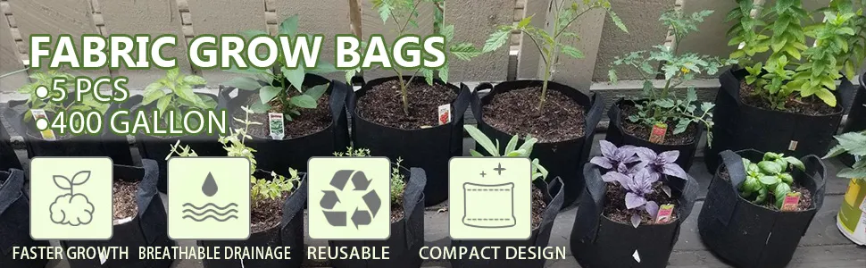Wir bieten 5er-Packs mit 400-Gallonen-Pflanzentaschen an, die ein sehr großes Fassungsvermögen haben und vielseitigere Alternativen zu herkömmlichen Gartenbehältern aus Ton oder Kunststoff darstellen.