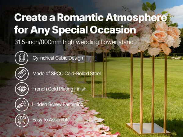 Unser Blumenständer für Hochzeiten vereint ein klassisches, zylindrisches Design mit einem verstärkten SPCC-Rahmen und doppelwandigen Paneelen für optimale Stabilität und eine Tragkraft von bis zu 15 kg. Die französische Goldgalvanisierung verleiht ihm zusätzliche Eleganz. Dank des umfangreichen Zubehörs ist der Ständer einfach aufzubauen und eignet sich ideal für Hochzeiten, Partys oder als Dekoration für Ihr Zuhause.