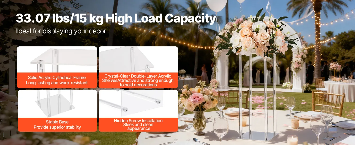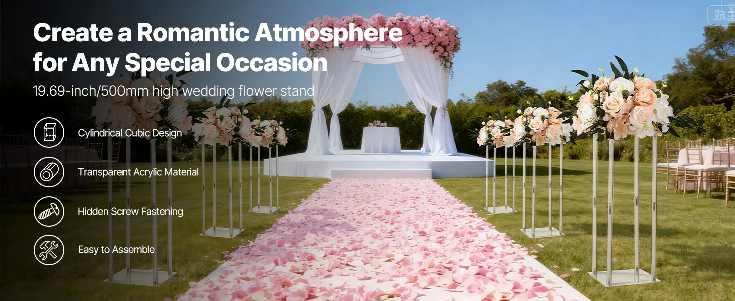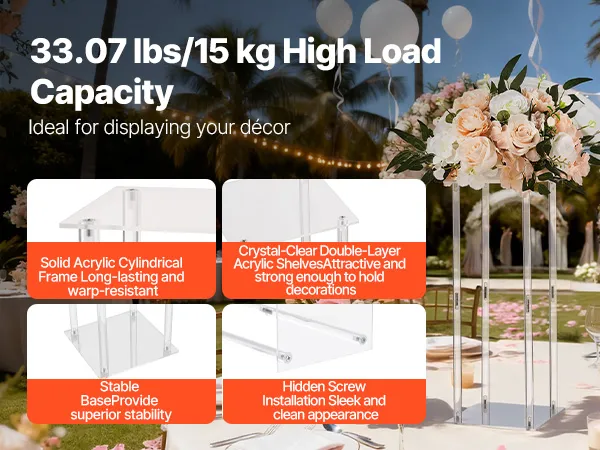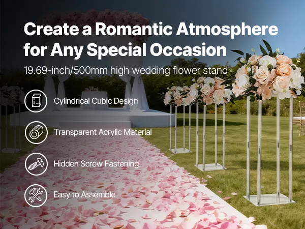 Dieser elegante Blumenständer im klassischen runden Würfeldesign trägt bis zu 15 kg. Stabile Acrylzylinder mit transparenten Doppelwandpaneelen sorgen für Langlebigkeit und ein ansprechendes Design. Verdeckte Schrauben und doppelte Befestigungselemente gewährleisten eine saubere Optik, und das mitgelieferte Zubehör ermöglicht einen schnellen Aufbau für Ihre Hochzeitsdekoration.