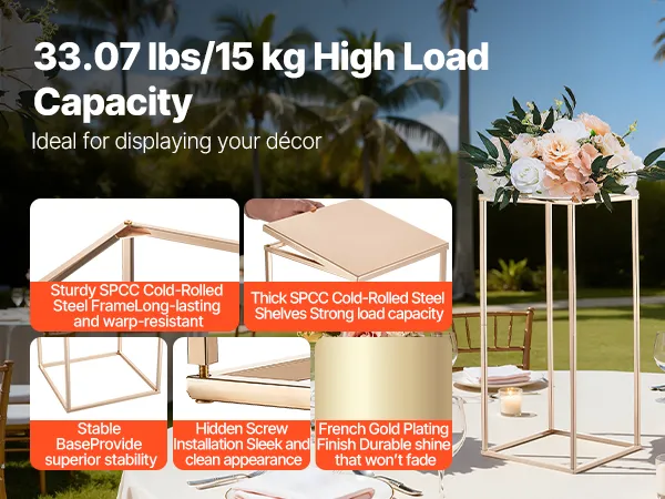 Mit seinem klassischen, rechteckigen Würfelgestell bietet dieser Blumenständer Platz für bis zu 15 kg Dekoration. Robustes SPCC-Stahlblech, transparente Acrylglasböden und eine französische Goldplattierung sorgen für eine langlebige und elegante Präsentation. Dank des kompletten Zubehörs ist der Ständer schnell aufgebaut und eignet sich daher ideal für Hochzeiten, Partys und als Dekoration für Zuhause.