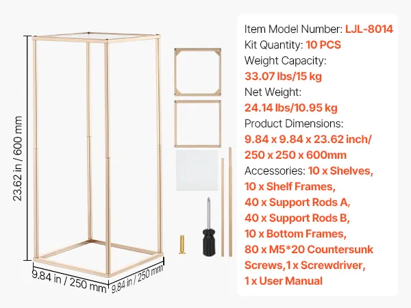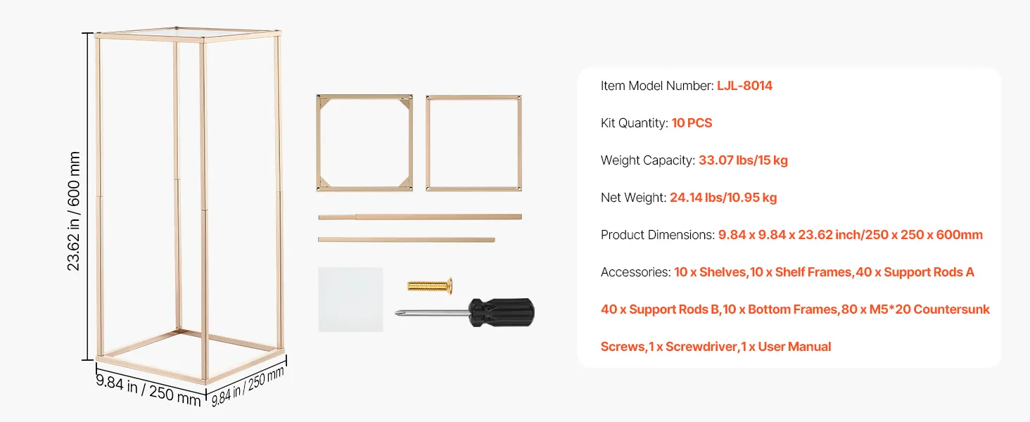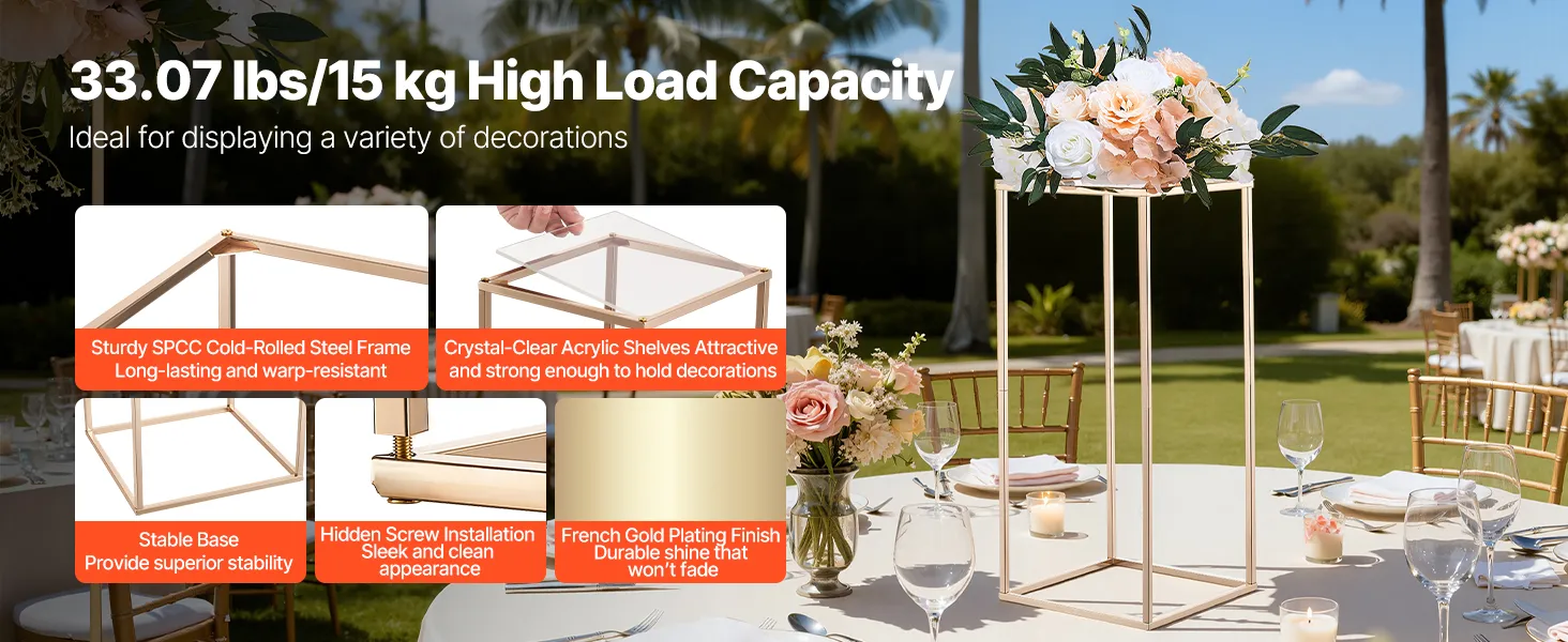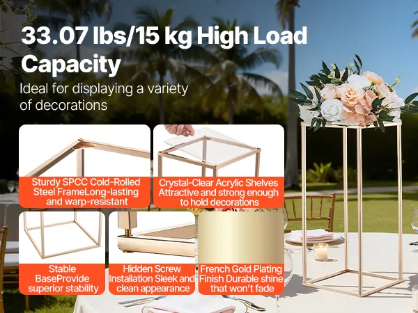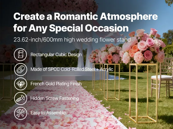 Verschönern Sie Ihre Veranstaltungen mit diesem 10-teiligen Blumenständer für Hochzeiten. Das rechteckige Gestell trägt bis zu 15 kg und ist aus robustem SPCC-Stahl gefertigt. Die transparenten Acrylregale sind in französischem Gold gehalten. Dank der vollständigen Komponenten ist der Ständer einfach aufzubauen und eignet sich ideal für Hochzeiten, Geburtstage, Partys oder Ihr Zuhause.