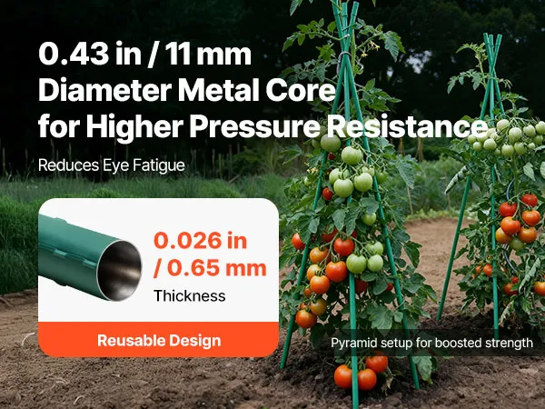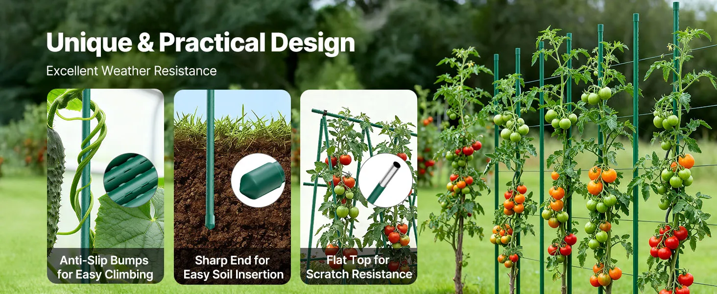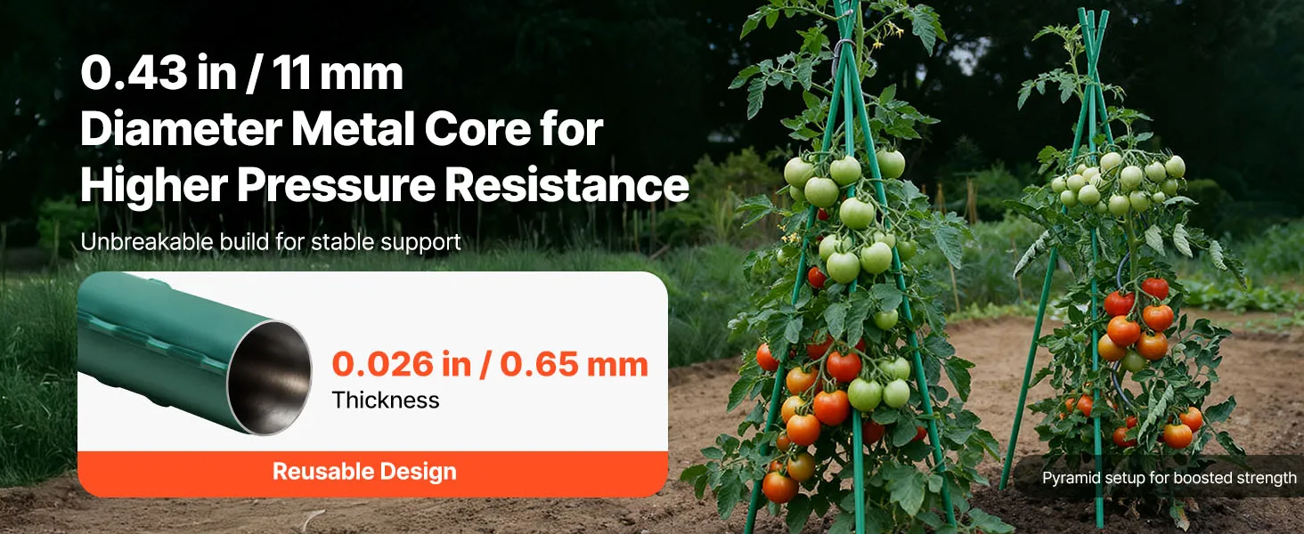 Diese Tomatenstäbe aus verdickten Metallrohren bieten erhöhte Druckfestigkeit und Stabilität und bleiben im Boden formstabil, ohne sich zu verbiegen oder zu verformen. Sie sind mehrfach wiederverwendbar und widerstehen effektiv dem Zug der Pflanzen sowie Windbewegungen – für dauerhafte Zuverlässigkeit.