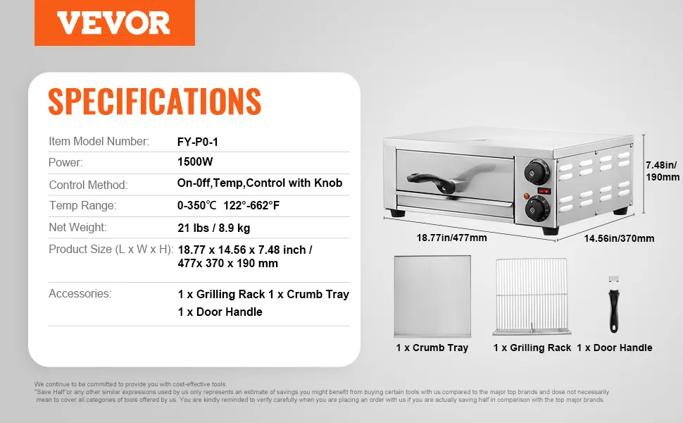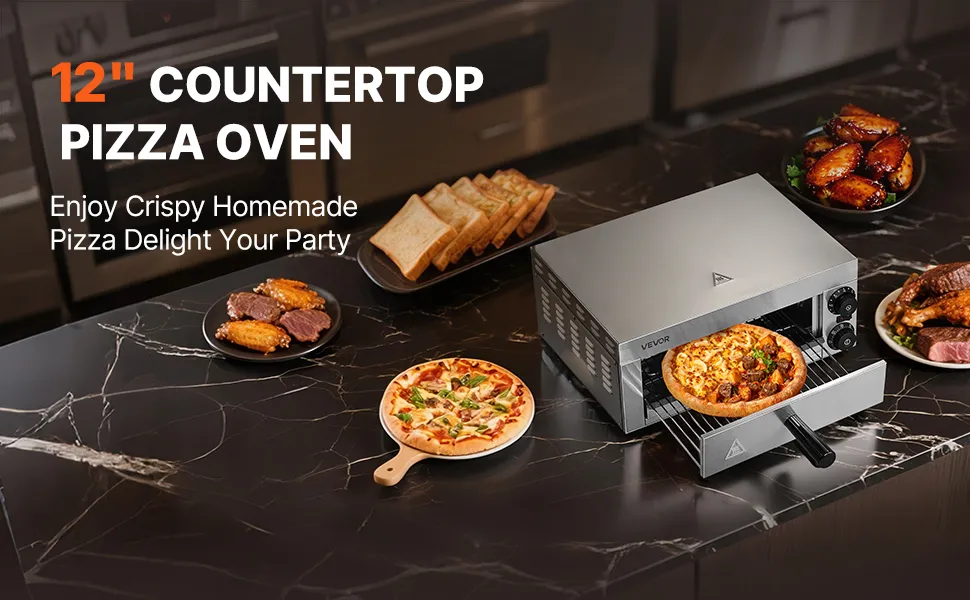 VEVOR Elektrischer Pizzaofen für Arbeitsplatten, 12 Zoll, 1500 W, mit Temperaturregelung und 0-60-Minuten-Timer, gleichmäßiger Backtechnologie und leicht zu reinigender Krümelschublade, ideal für gewerbliche und private Küchen