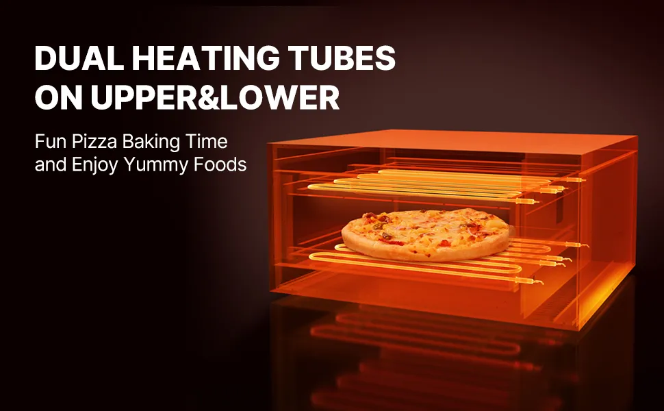 Mit dem leistungsstarken 1500-Watt-Pizzaofen backen Sie in nur wenigen Minuten köstliche, knusprige Pizzen. Dank der doppelten Heizrohre oben und unten sorgt er für gleichmäßiges Backen rundum und schnelles Erhitzen für schnelles Garen – für perfekt gegarte Pizzen.