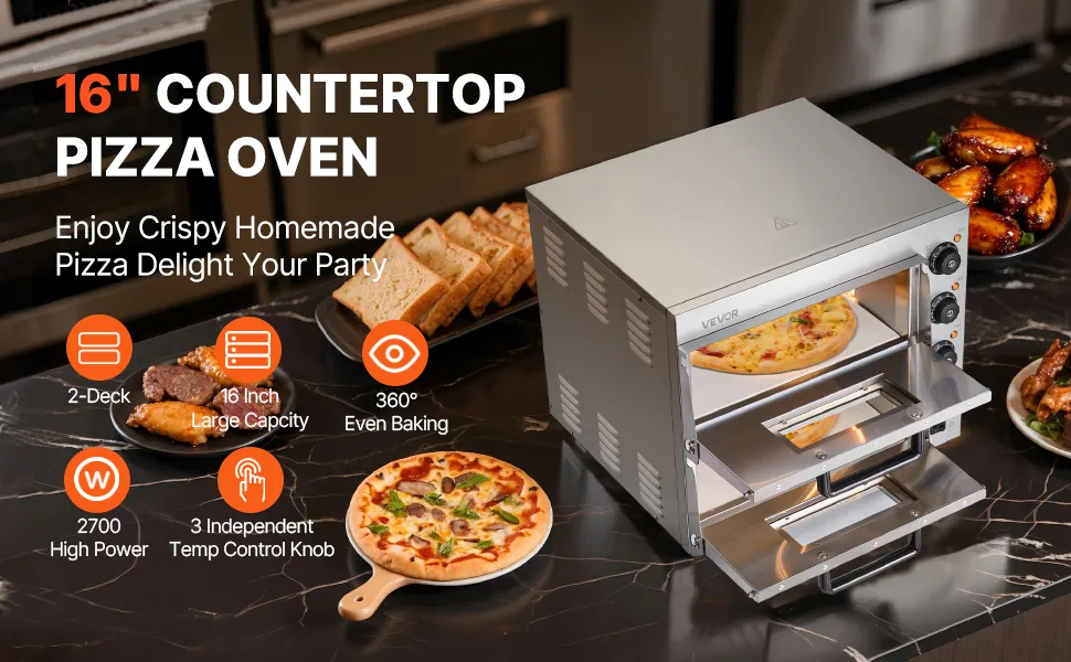 VEVOR Kommerzieller Pizzaofen für die Arbeitsplatte, 16-Zoll-Doppeldecker-Schichten, elektrischer Pizzaofen aus Edelstahl mit Stein und Griff, Mehrzweck-Pizzamaker für den Innenbereich zum Backen von Brezeln im Restaurant zu Hause