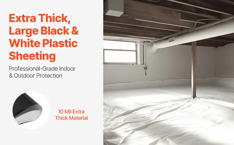 Diese 0,25 mm dicke, strapazierfähige Kunststofffolie ist reißfest und langlebig. Die große Kunststofffolie misst 3,05 x 19,81 m und deckt große Flächen ab. Doppelseitiges schwarz-weißes Design für Lichtreflexion, Blockierung und Feuchtigkeitskontrolle, ideal für Bauzwecke.