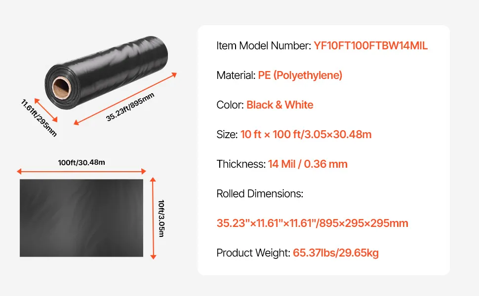Diese 0,35 mm dicke, strapazierfähige Kunststofffolie ist reißfest und langlebig. Mit den Maßen 3,05 x 30,48 m deckt die große Kunststofffolie große Flächen ab. Doppelseitiges schwarz-weißes Design für Lichtreflexion, Blockierung und Feuchtigkeitskontrolle, ideal für Bauzwecke.