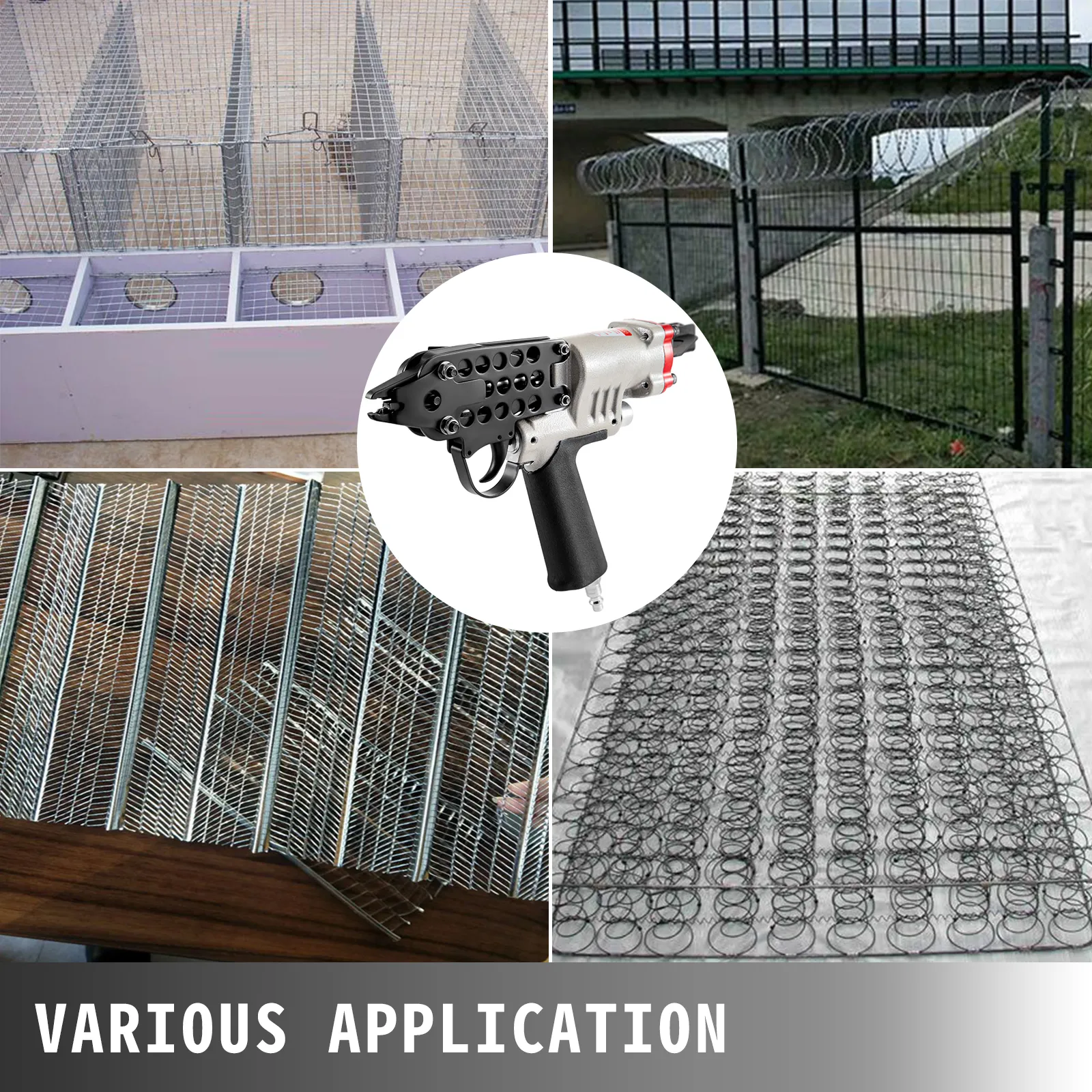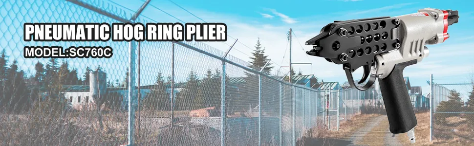 Die pneumatische Schweineringpistole ist ein perfektes Werkzeug für die Umreifung oder Befestigung von Zäunen, Drahtkäfigen, Autopolstern, Bettzeug, Geländern, Federkernmatratzen und anderen Bindungen.