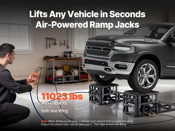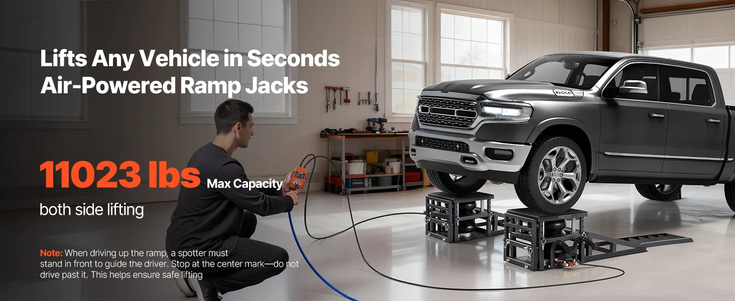 Pneumatic Ramp Jack: This air portable car lift combines a repair ramp with a pneumatic jack. With the included controller, both jacks lift together in 1-6 seconds, making undercarriage repairs faster and effortless