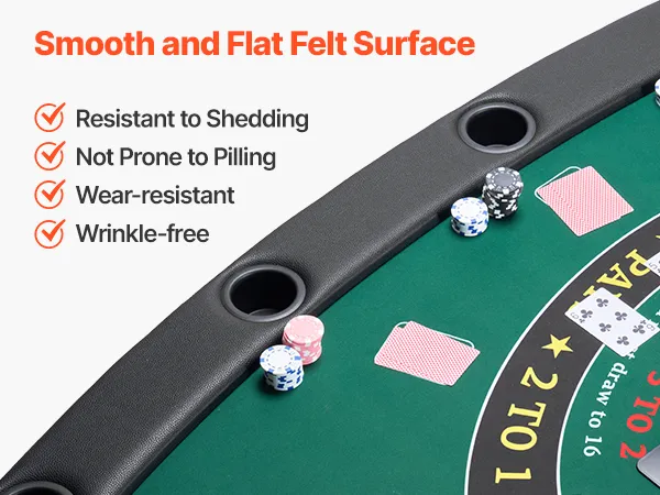 7 Getränkehalter & Filzoberfläche: Jeder Spielerplatz am Pokertisch verfügt über einen integrierten Getränkehalter aus Metall, der mehr Platz für Getränke bietet. Der Kasino-Filz reduziert Geräusche beim Herunterfallen von Gegenständen und erleichtert das Aufheben der Karten