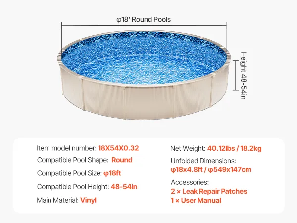 Passend für 18 Fuß / 549 cm große Pools: Diese Poolfolie ist speziell für runde Aufstellpools mit 18 Fuß / 549 cm Durchmesser, flachem Boden und einer Wandhöhe von bis zu 54 Zoll / 137 cm konzipiert und gewährleistet eine perfekte und sichere Passform.