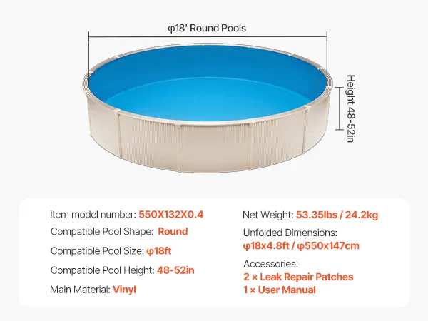 Diese Poolfolie aus strapazierfähigem Vinyl ist für runde Pools mit einem Durchmesser von 550 cm und einer Wandhöhe von bis zu 132 cm geeignet. Es ist auf Langlebigkeit ausgelegt und widersteht Verschleiß, Einstichen und Rissen.