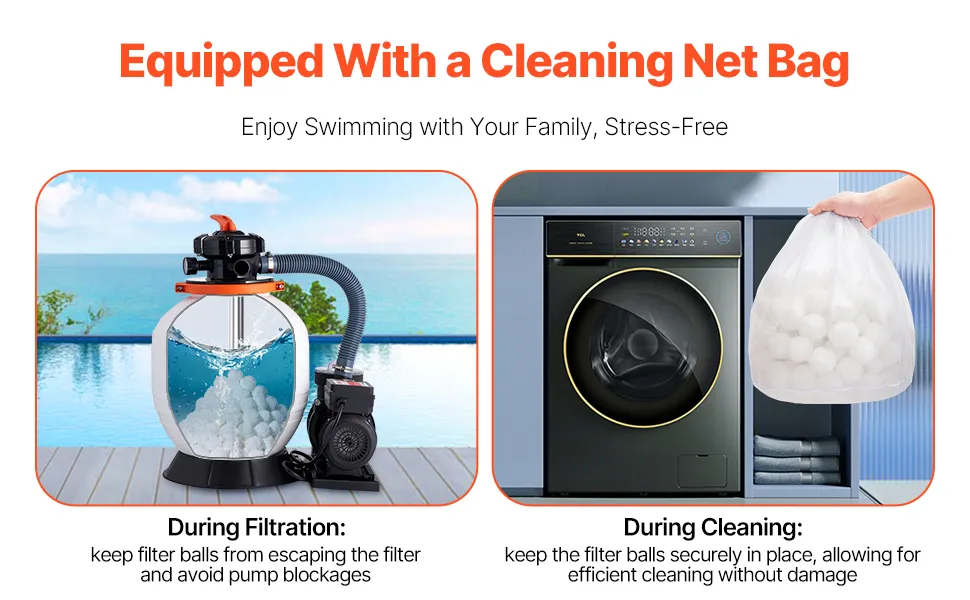 Die Filterbälle für Schwimmbäder werden mit einem Reinigungsnetzbeutel geliefert, der für die Verwendung mit den Filterbällen entwickelt wurde, um Verstopfungen in Ihrem Filtersystem zu vermeiden.