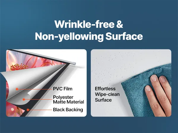 Die Projektionsleinwand aus hochreflektierendem, knitterfreiem PVC unterstützt 4K und Shutter 3D für scharfe, lebendige Bilder. Jedes Bild ist naturgetreu und detailreich und sorgt für ein kinoähnliches Erlebnis, egal ob bei schwachem Licht oder heller Umgebung.