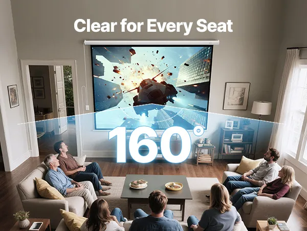 Weite Betrachtungswinkel: Mit einem 160°-Weitwinkel-Projektionsdesign sorgt unsere elektrische Projektionsleinwand dafür, dass die Zuschauer von jedem Sitzplatz aus scharfe, klare Bilder erfassen können. Dies erhöht die Betrachtungsflexibilität und macht jede Ecke zu einem erstklassigen Platz, um die Show zu genießen
