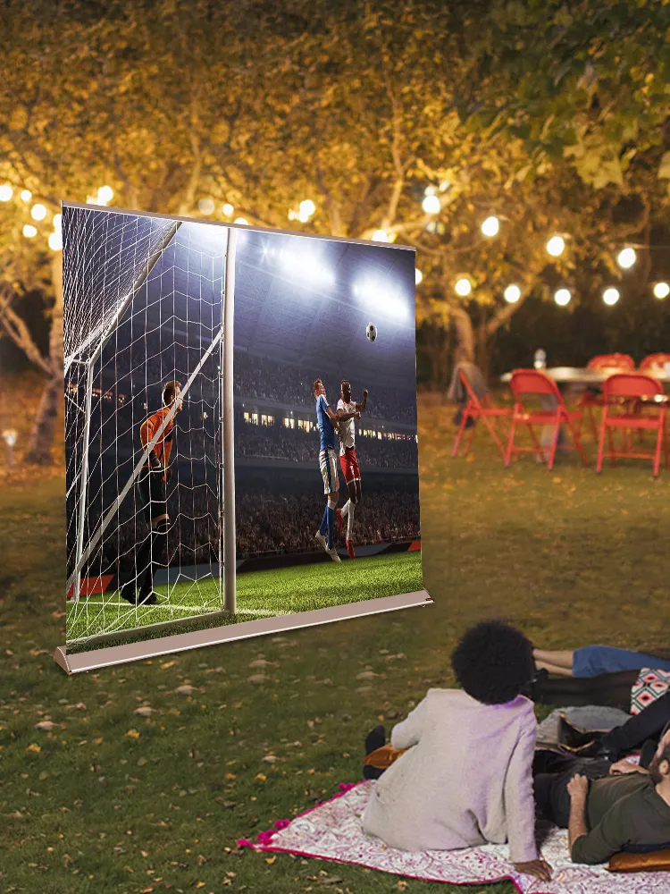 Dieser Bildschirm ist leicht und dennoch robust. Diese doppelte Eigenschaft verbessert seine Tragbarkeit und Haltbarkeit. Der Aluminiumrahmen bietet eine starke Basis, während der mattweiße Stoff für Stabilität sorgt. Sie können den Bildschirm tragen und aufstellen, ohne sich durch sein Gewicht belastet zu fühlen. Das robuste Design sorgt außerdem dafür, dass der Bildschirm während der Verwendung stabil bleibt. Es verringert das Risiko, dass er bei Verwendung im Freien umgeworfen oder vom Wind bewegt wird. Seine leichte, aber robuste Konstruktion erleichtert die Handhabung. So können Sie überall hochwertige Seherlebnisse genießen. Das Design garantiert eine längere Lebensdauer Ihres Bildschirms und bietet im Laufe der Zeit eine gleichbleibende Leistung.