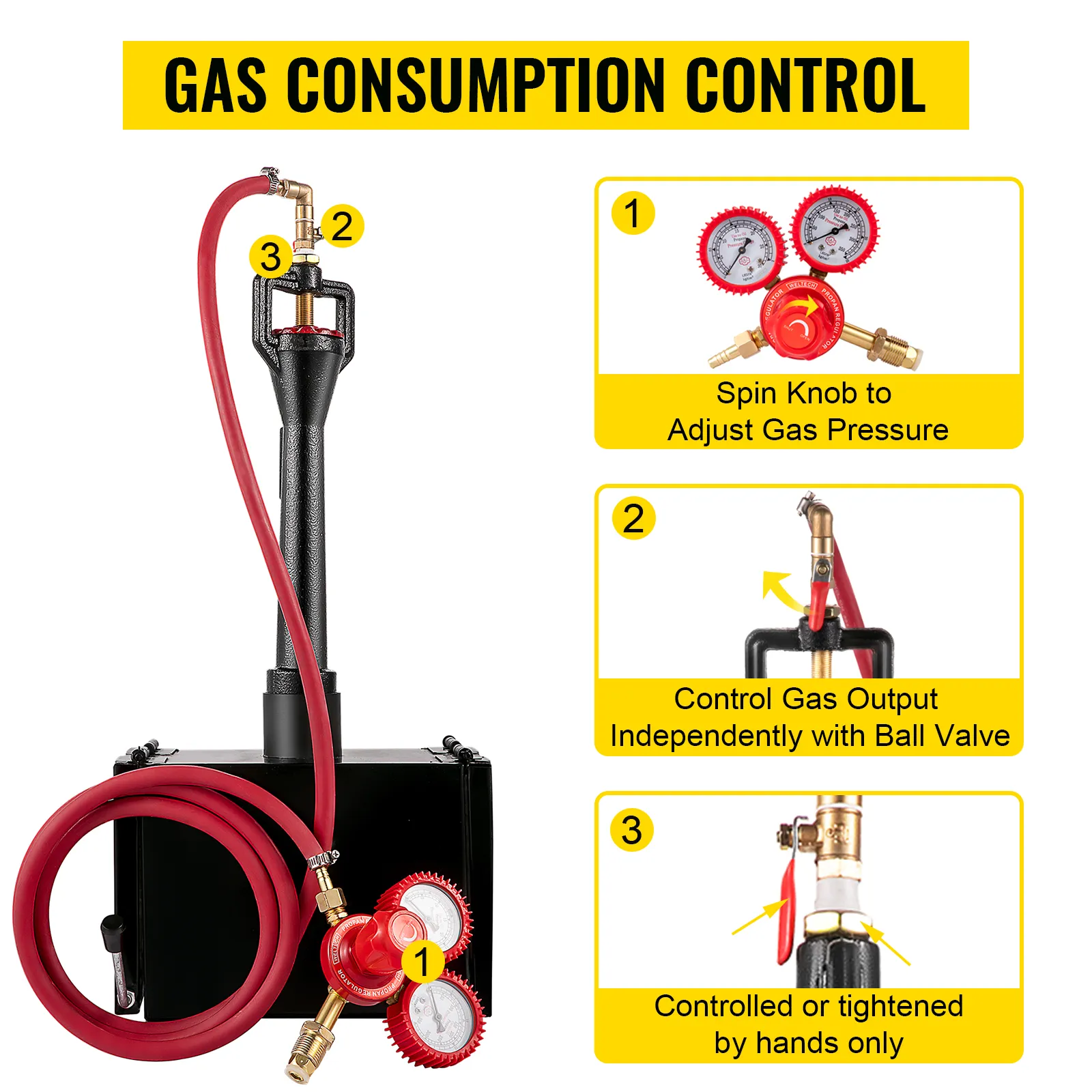 Diese Hufschmiede unterstützt die Einstellung des Gasdrucks zur Kontrolle des Gasverbrauchs durch Drehen des Knopfes am Regler. Außerdem kann die Gasabgabe unabhängig durch den Kugelhahn gesteuert werden, der mühelos ausgetauscht werden kann.