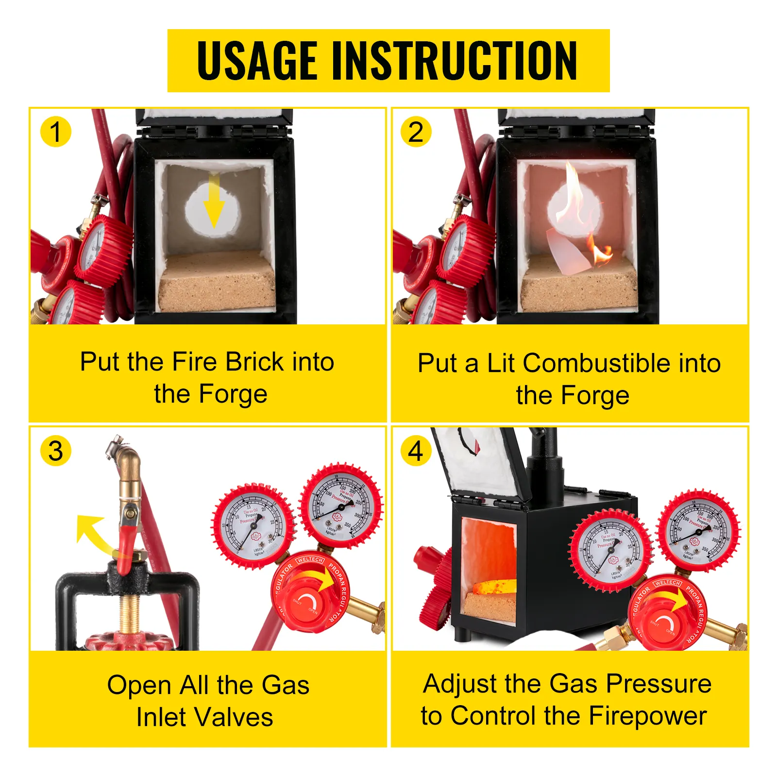 Hier ist die einfache Anleitung für unsere Propan-Schmiede zur Messerherstellung. Schritt 1: Legen Sie den Schamottestein in den Ofen. Schritt 2: Öffnen Sie alle Gaseinlassventile, um das Gas in einem kleinen Volumen freizusetzen. Schritt 3: Zünden Sie das Gas an. Schritt 4: Stellen Sie den Gasdruck ein, um die Feuerleistung zu kontrollieren.