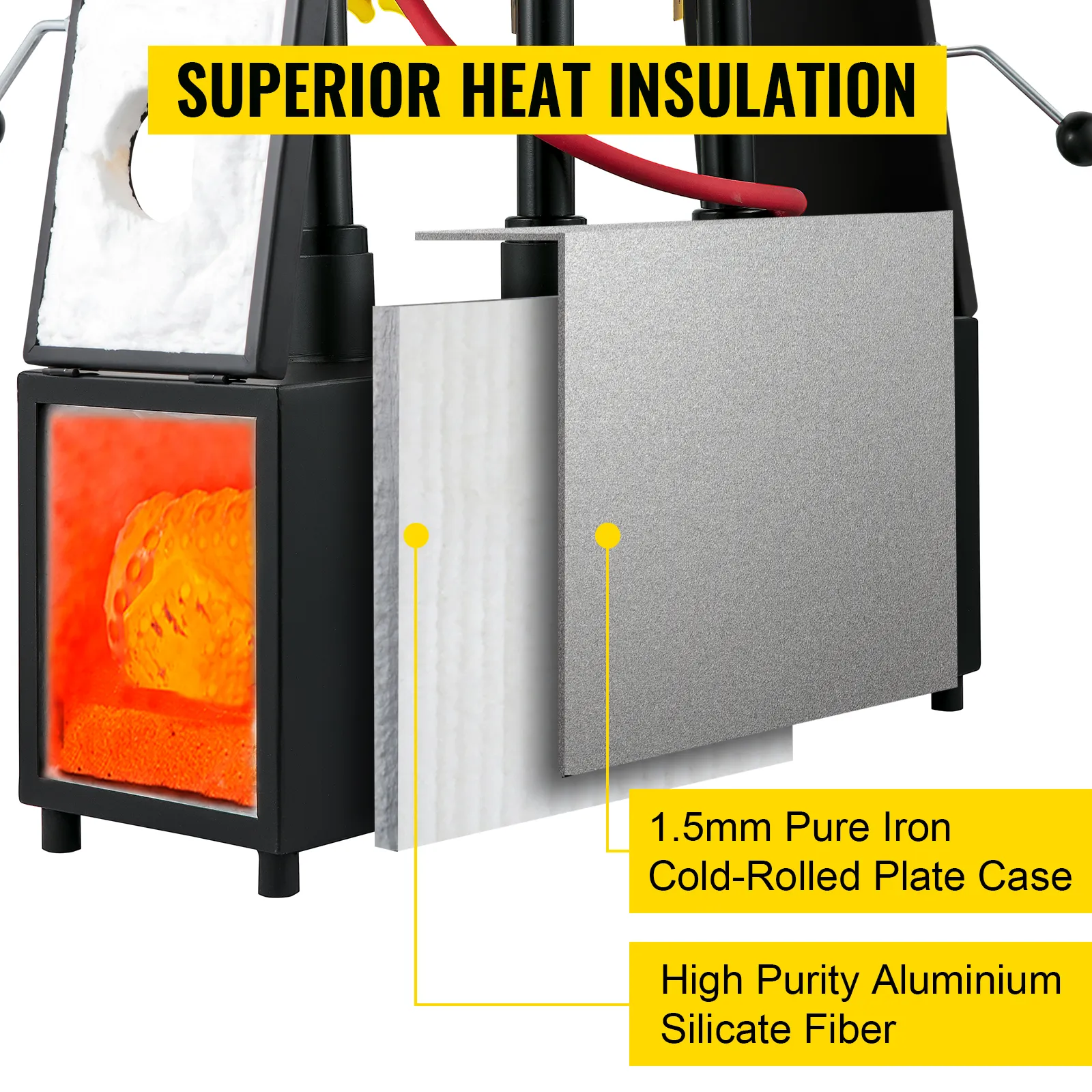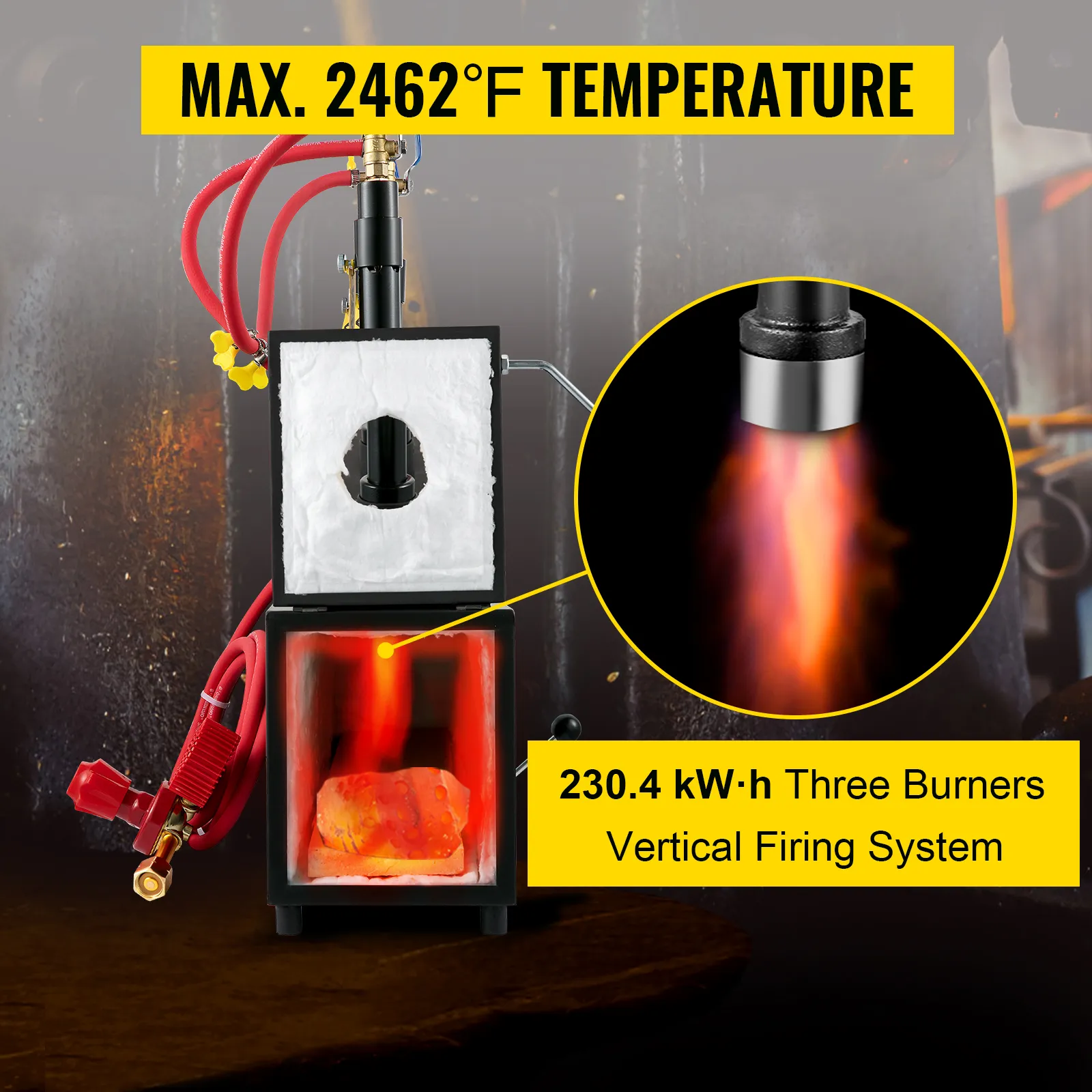 Unsere Propan Messerschmiede ist zum Schmieden gebaut. Maximale Heiztemperatur: ca. 2462 °F / 1350 °C, geeignet zum Schmieden von Metallen. Unser vertikal ausgelegtes Feuerungssystem maximiert die Heizeffizienz unseres 230,4 kWh / 786.000 BTU Brenners.