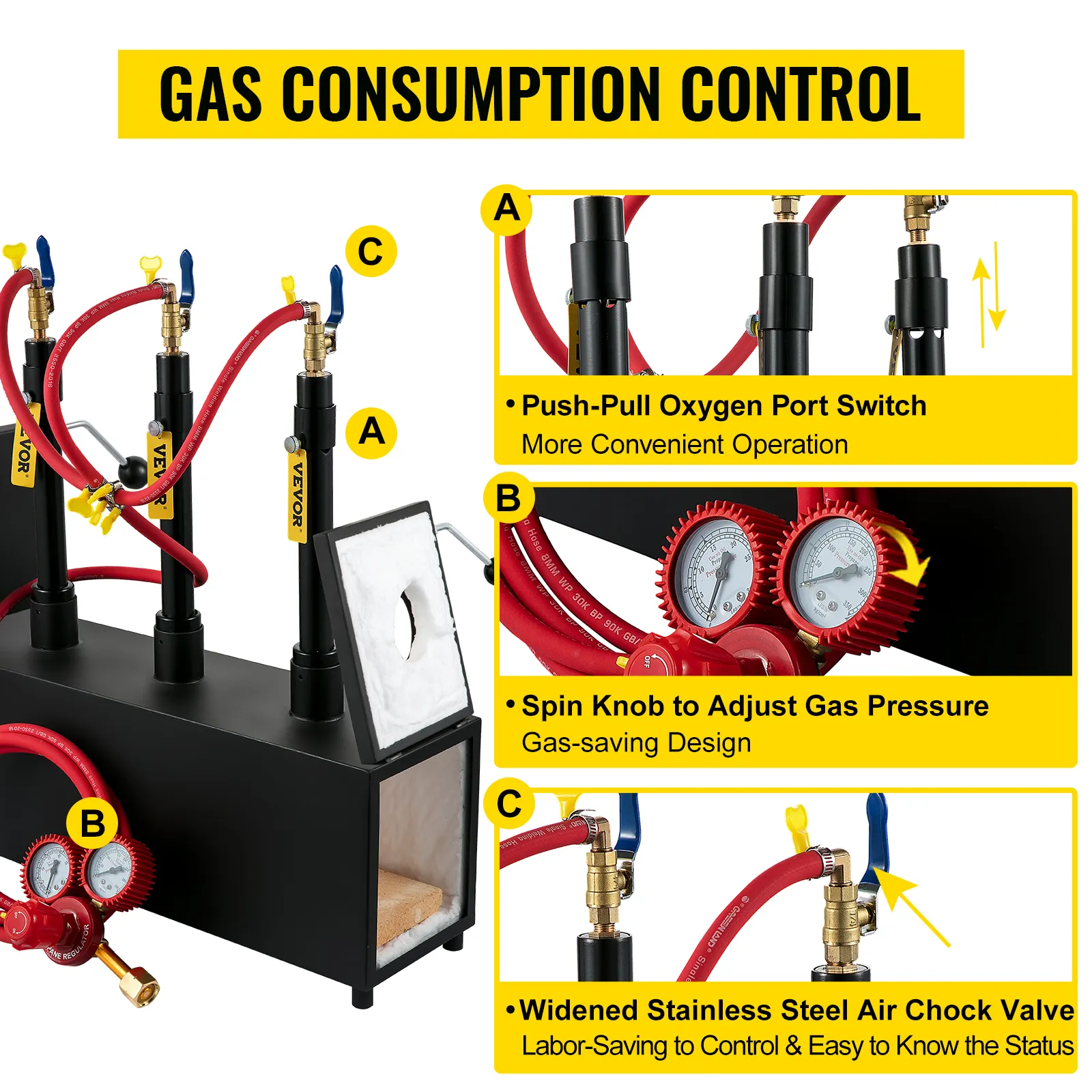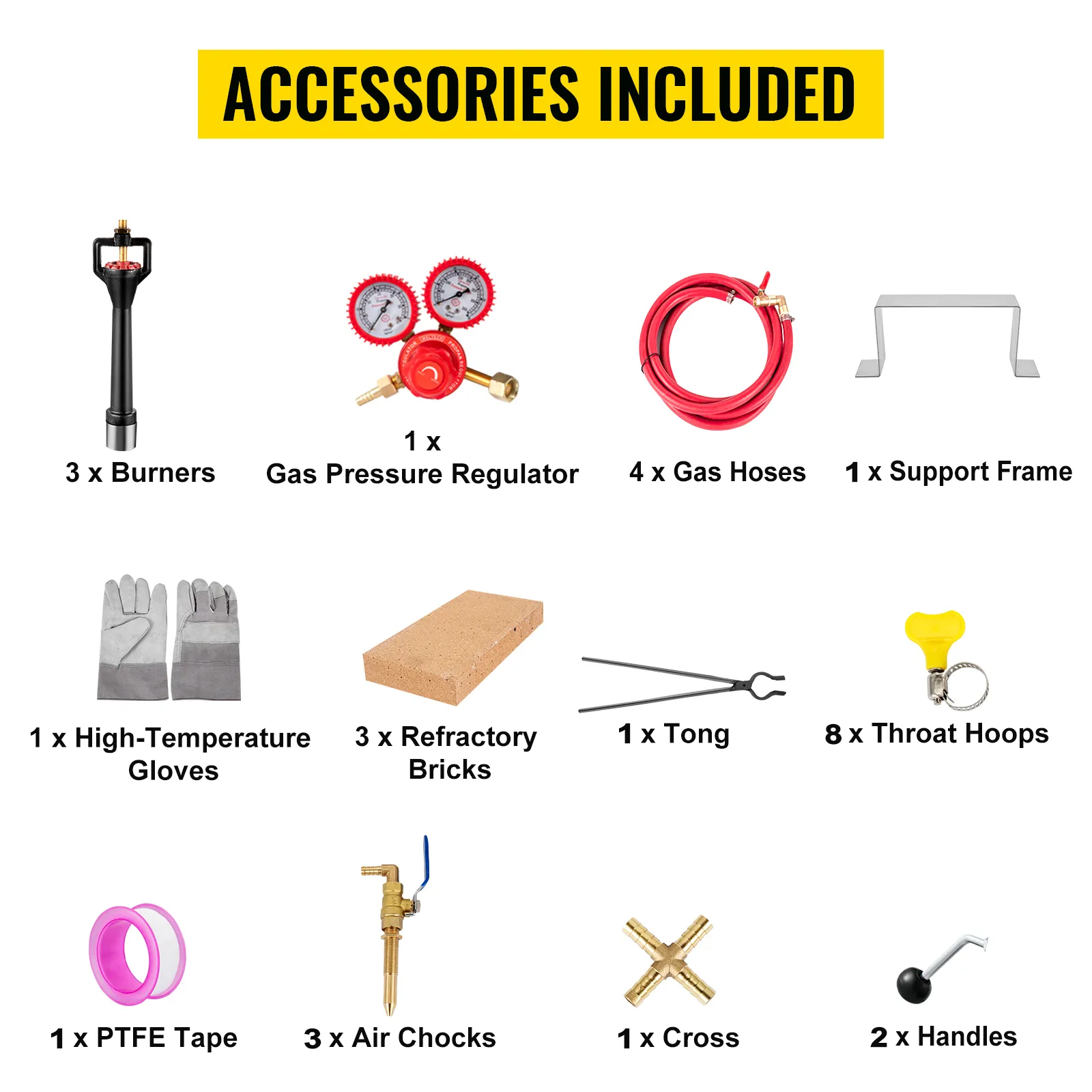 Wir bieten Ihnen komplettes Zubehör für das Schmieden. So können Sie Ihre Kreativität beim Schmieden frei entfalten. Dazu gehören ein Paar Hochtemperaturhandschuhe, eine Zange, 4 Gasschläuche, ein Gasdruckregler, 3 feuerfeste Steine, ein Stützrahmen, 3 Brenner usw.