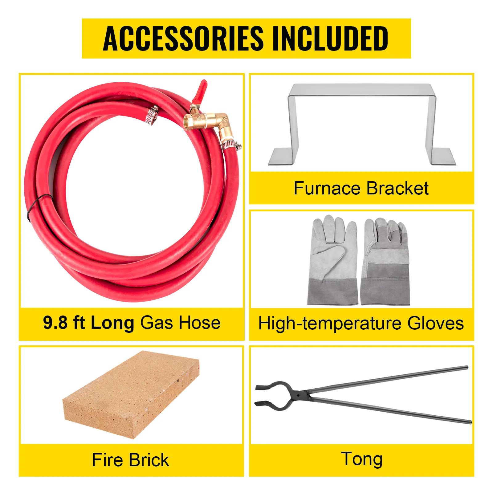 Mit unserer Propangas-Schmiede liefern wir ein ganzes Set an Zubehör für das Schmieden mit, darunter einen 9,8 Fuß / 3 m langen Gasschlauch, eine Ofenhalterung, einen Feuerstein, einen Hochtemperaturhandschuh und eine Zange. So können Sie Ihre Kreativität beim Schmieden voll entfalten.
