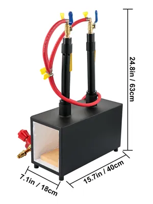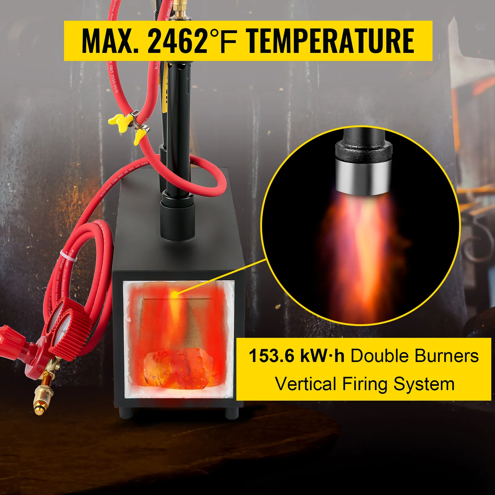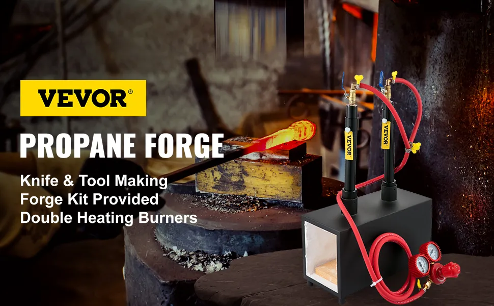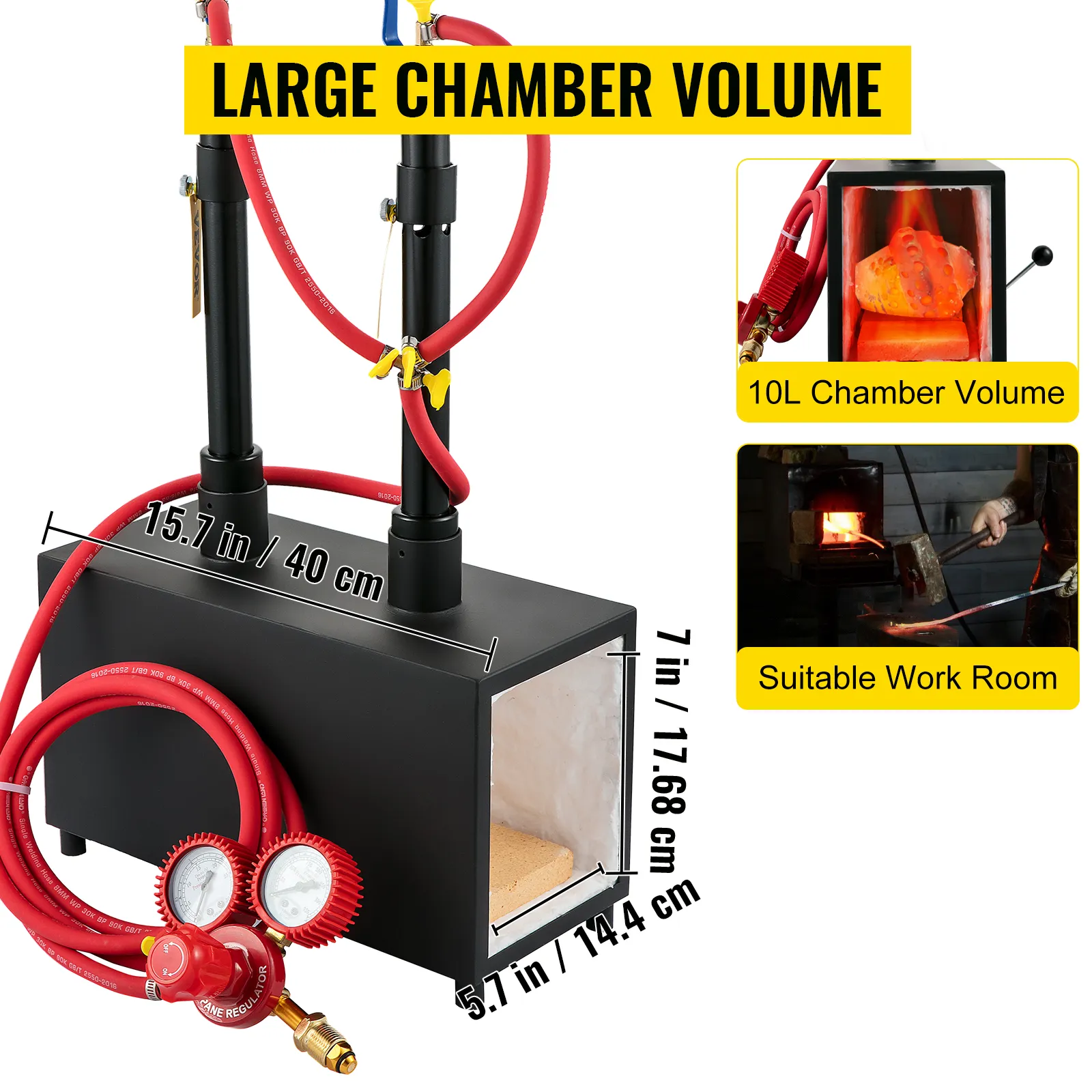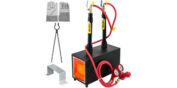 Alle diese Zubehörteile sind im Lieferumfang enthalten: ein Paar Hochtemperaturhandschuhe, eine Zange, drei Gasschläuche, ein Gasdruckregler, zwei Schamottsteine, ein Stützrahmen, zwei Brenner usw. Sie können gleich mit der Schmiedearbeit beginnen!
