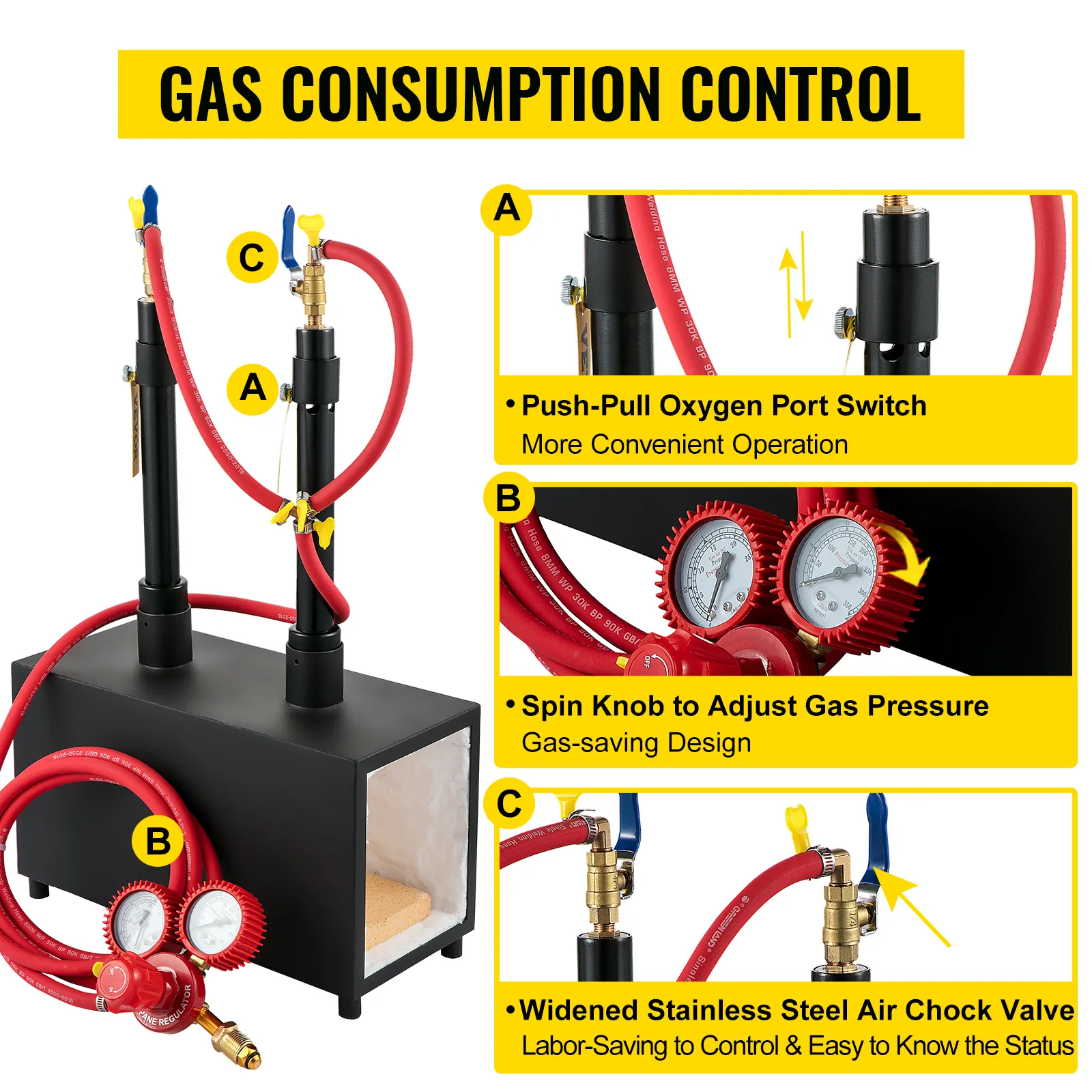 Sie können den Gasdruck mit dem Regler einstellen. Durch den Kugelhahn kann die Gasabgabe gesteuert werden. Sauerstoffzufuhr ist durch Schiebeschalter regelbar. Leichtes Schmieden im Handumdrehen.