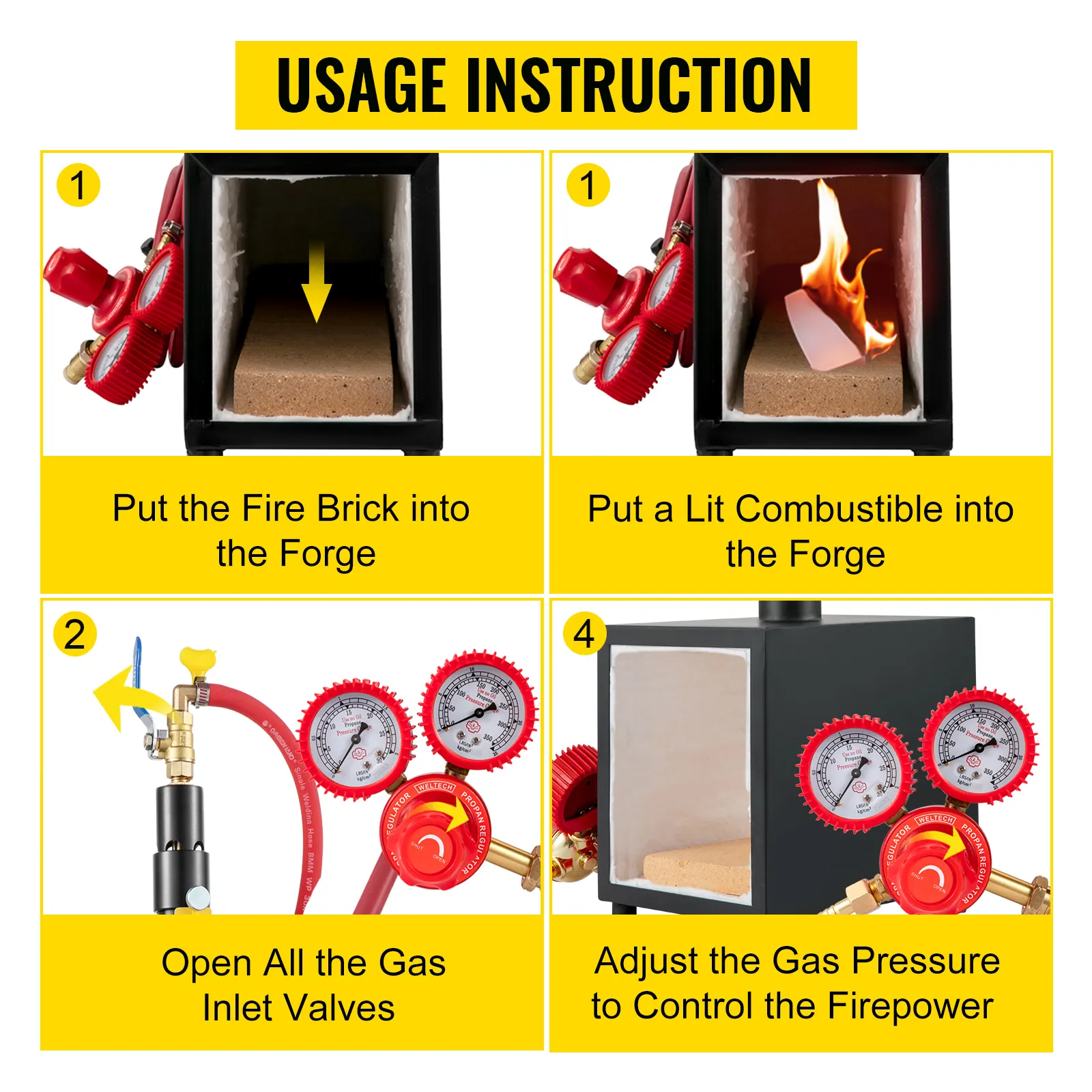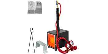 Ein Paar Hochtemperaturhandschuhe, eine Zange, ein Gasschlauch, ein Gasdruckregler, ein Schamottstein, ein Stützrahmen, ein Brenner, zwei Halsreifen usw. Alle diese Zubehörteile sind im Lieferumfang enthalten. Sie können gleich mit der Schmiedearbeit beginnen!