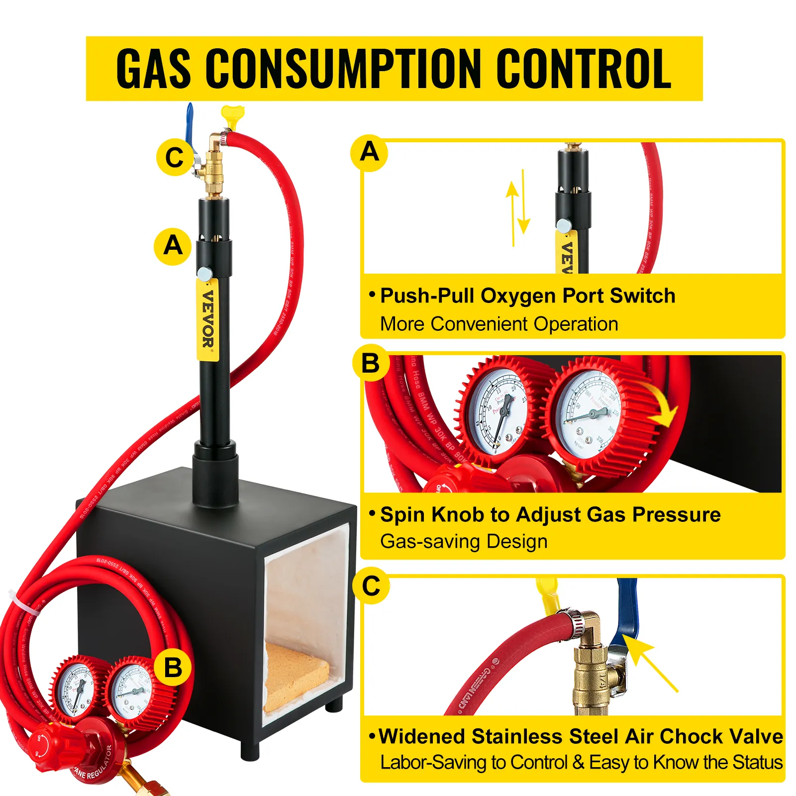 Der Gasdruck durch Drehen des Reglers einstellbar. Die Gasabgabe kann durch den Kugelhahn gesteuert werden. Ein Schiebeschalter regelt die Sauerstoffzufuhr. Die Schmiede ist einfach zu bedienen.