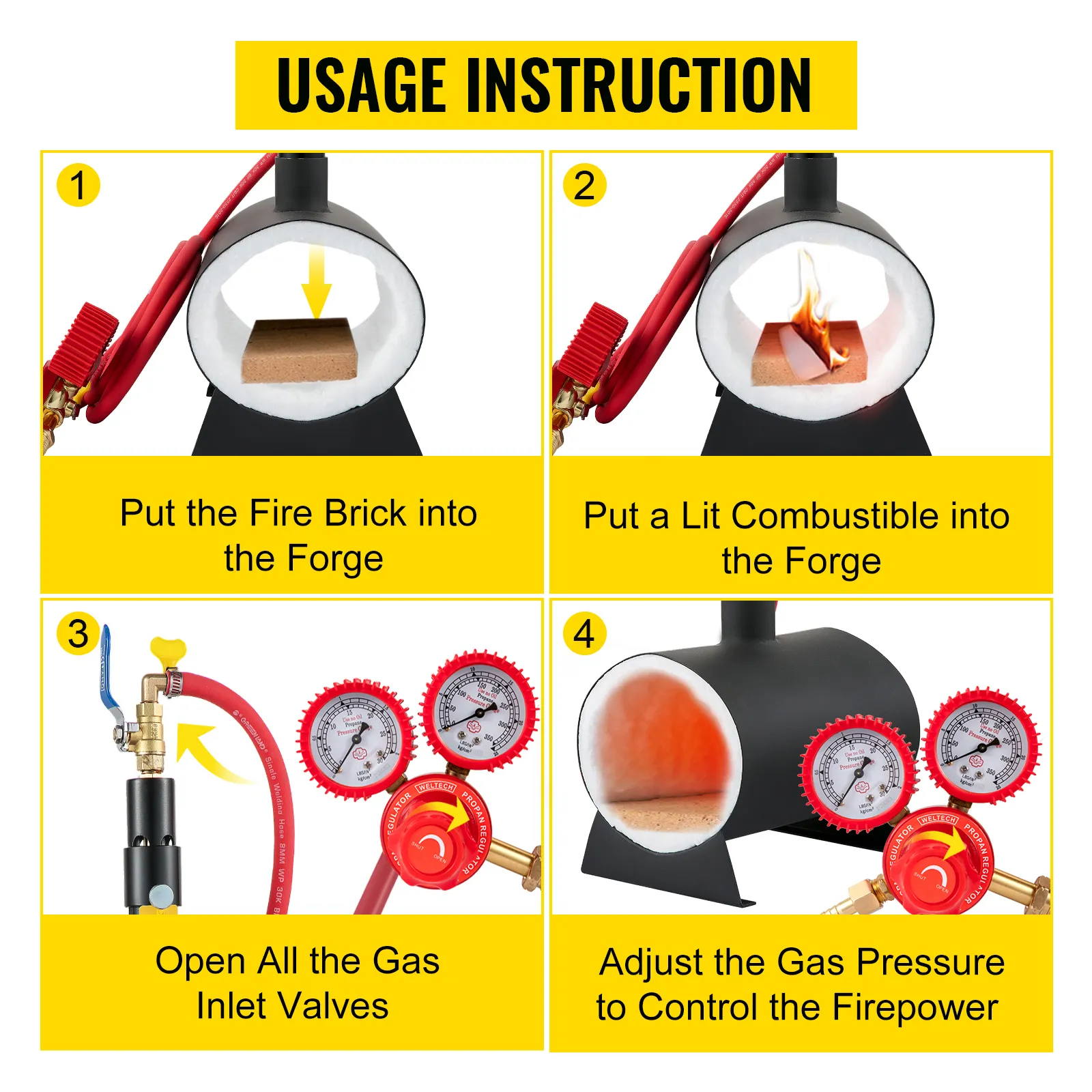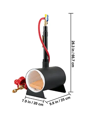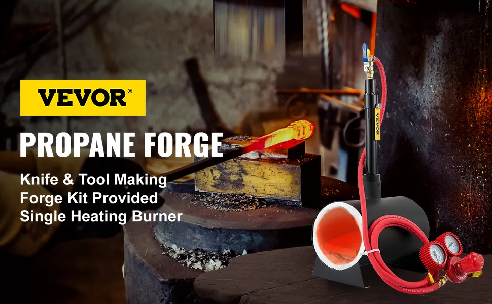 Folgende Zubehörteile sind im Lieferumfang enthalten: ein Paar Hochtemperaturhandschuhe, eine Zange, ein Gasschlauch, ein Gasdruckregler, ein Schamottstein, ein Stützrahmen, ein Brenner, zwei Halsreifen usw. Sie können gleich mit der Schmiedearbeit beginnen!