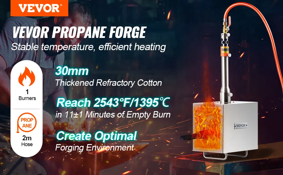Effiziente Beheizung & stabile Temperatur: Die 30 mm dicke feuerfeste Baumwollkonstruktion der tragbaren Propangasschmiede sorgt für eine effiziente Wärmekonzentration und minimiert Wärmeverluste. In Kombination mit einem leistungsstarken Brenner wird eine starke und gleichmäßige Hitze erzeugt, sodass die Schmiede schnell eine stabile Temperatur von bis zu 2600 °F (1427 ℃) erreichen und halten kann. Dank seiner überlegenen Leistung können Sie problemlos hochwertige Metallwerkzeuge oder Kunstwerke herstellen.