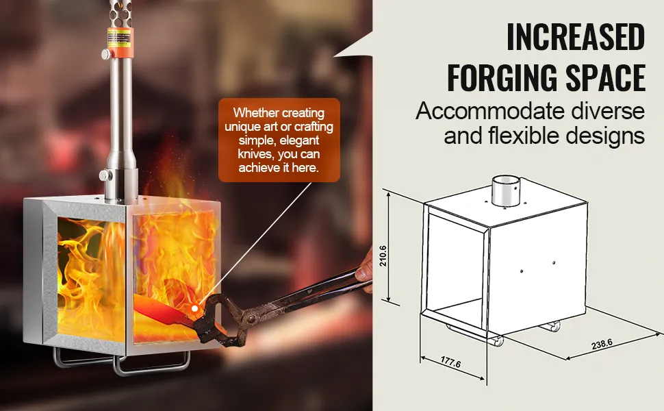 Mehr Platz & flexible Beschickung: Die Schmiede hat ein quadratisches Design, wodurch ein größerer und geräumigerer Innenraum entsteht, der Platz für Metallvorräte unterschiedlicher Größe und Form bietet. Dieses Design unterstützt verschiedene Schmiedeanforderungen, ob es sich nun um Messer, Nägel, Armbänder, Schrauben oder Scheren handelt. Darüber hinaus verbessert der wissenschaftlich konzipierte Innenraum die Heizleistung.