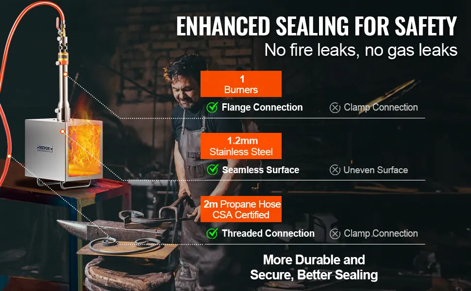 Verbesserte Verarbeitung & Haltbarkeit: Die hochwertige Verarbeitung erhöht die Sicherheit während der Produktion. Diese Propangasschmiede aus korrosionsbeständigem Edelstahl 201 widersteht hohen Temperaturen, Rauchgasen und chemischer Korrosion und gewährleistet so eine lange Lebensdauer.